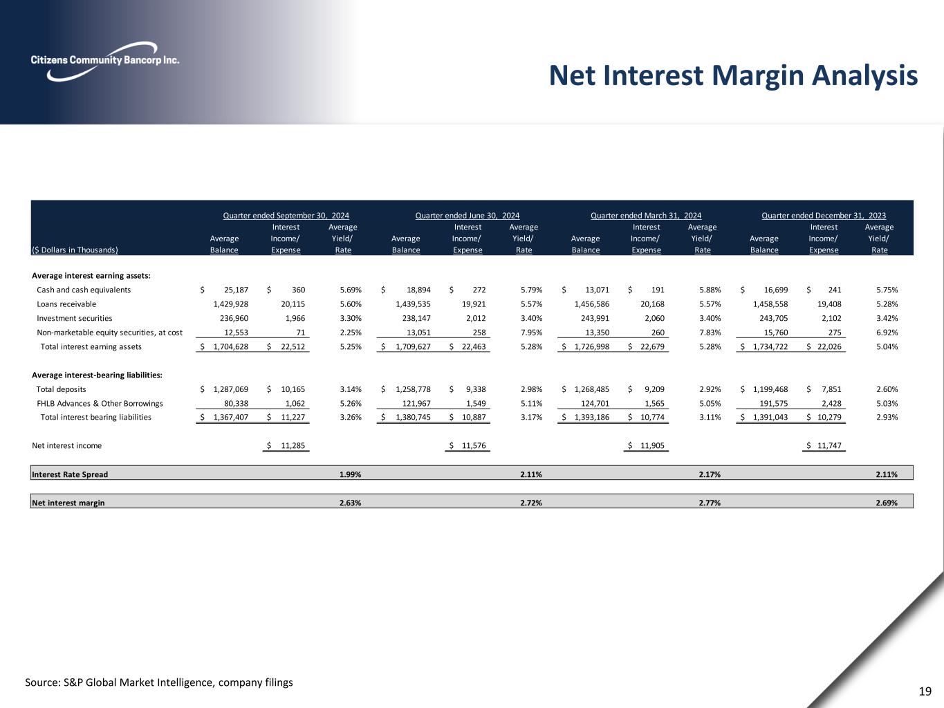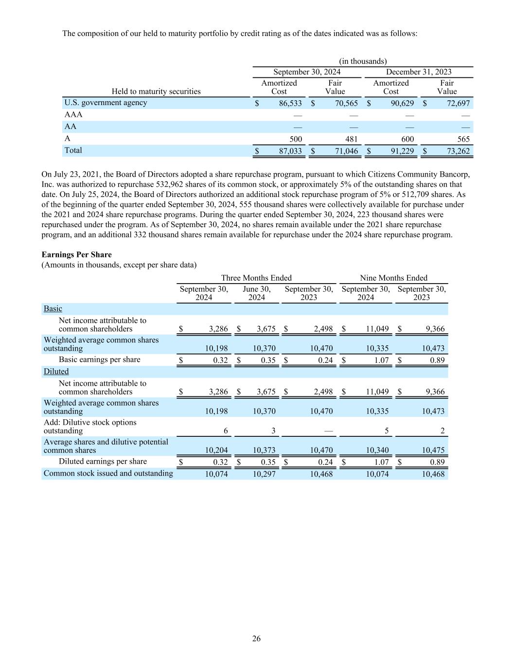 The composition of our held to maturity portfolio by credit rating as of the dates indicated was as follows: (in thousands) September 30, 2024 December 31, 2023 Held to maturity securities Amortized Cost Fair Value Amortized Cost Fair Value U.S. government agency $ 86,533 $ 70,565 $ 90,629 $ 72,697 AAA — — — — AA — — — — A 500 481 600 565 Total $ 87,033 $ 71,046 $ 91,229 $ 73,262 On July 23, 2021, the Board of Directors adopted a share repurchase program, pursuant to which Citizens Community Bancorp, Inc. was authorized to repurchase 532,962 shares of its common stock, or approximately 5% of the outstanding shares on that date. On July 25, 2024, the Board of Directors authorized an additional stock repurchase program of 5% or 512,709 shares. As of the beginning of the quarter ended September 30, 2024, 555 thousand shares were collectively available for purchase under the 2021 and 2024 share repurchase programs. During the quarter ended September 30, 2024, 223 thousand shares were repurchased under the program. As of September 30, 2024, no shares remain available under the 2021 share repurchase program, and an additional 332 thousand shares remain available for repurchase under the 2024 share repurchase program. Earnings Per Share (Amounts in thousands, except per share data) Three Months Ended Nine Months Ended September 30, 2024 June 30, 2024 September 30, 2023 September 30, 2024 September 30, 2023 Basic Net income attributable to common shareholders $ 3,286 $ 3,675 $ 2,498 $ 11,049 $ 9,366 Weighted average common shares outstanding 10,198 10,370 10,470 10,335 10,473 Basic earnings per share $ 0.32 $ 0.35 $ 0.24 $ 1.07 $ 0.89 Diluted Net income attributable to common shareholders $ 3,286 $ 3,675 $ 2,498 $ 11,049 $ 9,366 Weighted average common shares outstanding 10,198 10,370 10,470 10,335 10,473 Add: Dilutive stock options outstanding 6 3 — 5 2 Average shares and dilutive potential common shares 10,204 10,373 10,470 10,340 10,475 Diluted earnings per share $ 0.32 $ 0.35 $ 0.24 $ 1.07 $ 0.89 Common stock issued and outstanding 10,074 10,297 10,468 10,074 10,468 26