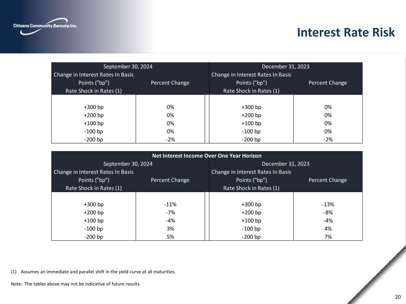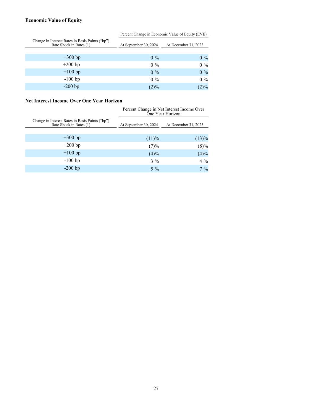 Economic Value of Equity Percent Change in Economic Value of Equity (EVE) Change in Interest Rates in Basis Points (“bp”) Rate Shock in Rates (1) At September 30, 2024 At December 31, 2023 +300 bp 0 % 0 % +200 bp 0 % 0 % +100 bp 0 % 0 % -100 bp 0 % 0 % -200 bp (2) % (2) % Net Interest Income Over One Year Horizon Percent Change in Net Interest Income Over One Year Horizon Change in Interest Rates in Basis Points (“bp”) Rate Shock in Rates (1) At September 30, 2024 At December 31, 2023 +300 bp (11) % (13) % +200 bp (7) % (8) % +100 bp (4) % (4) % -100 bp 3 % 4 % -200 bp 5 % 7 % 27