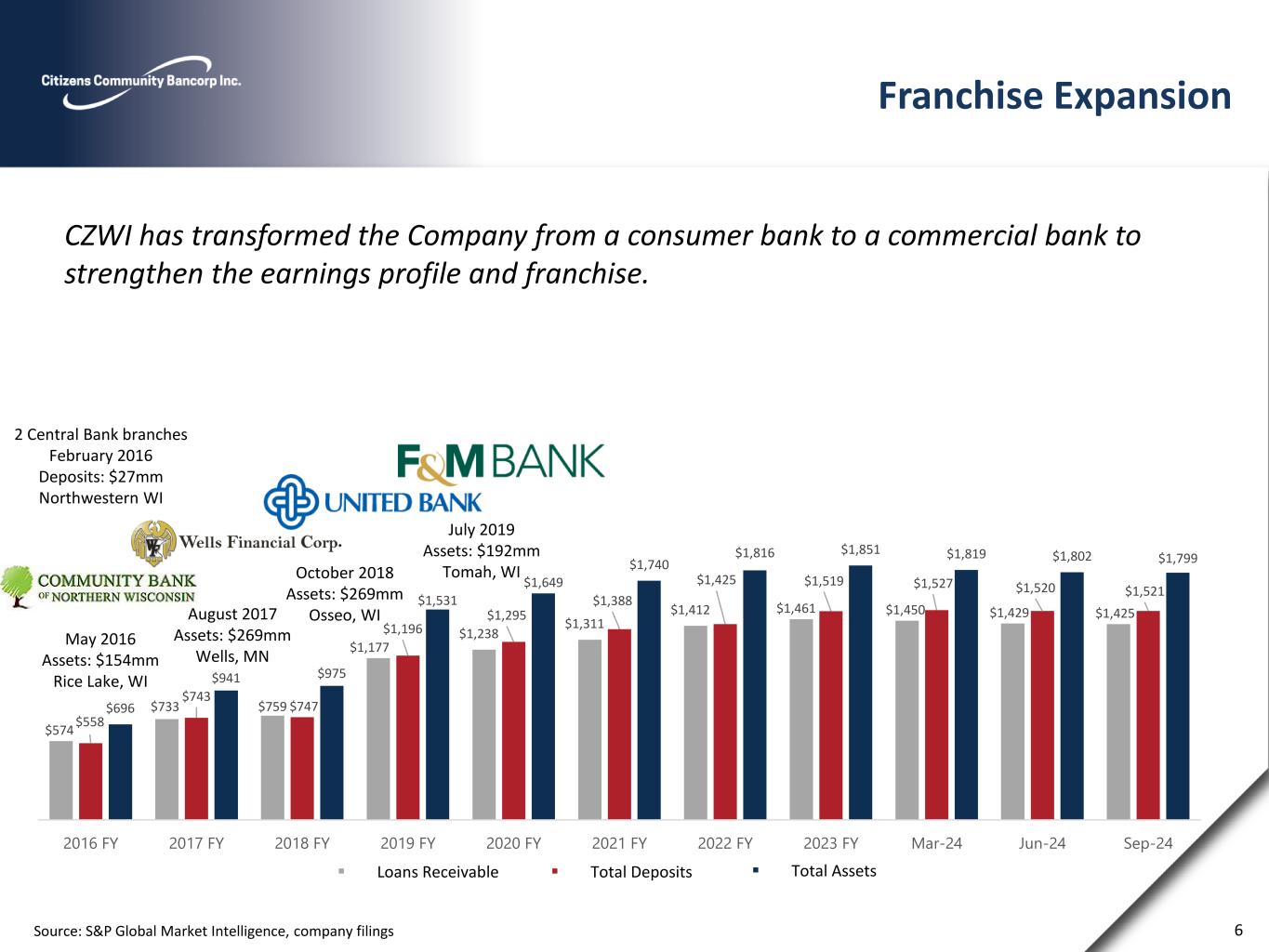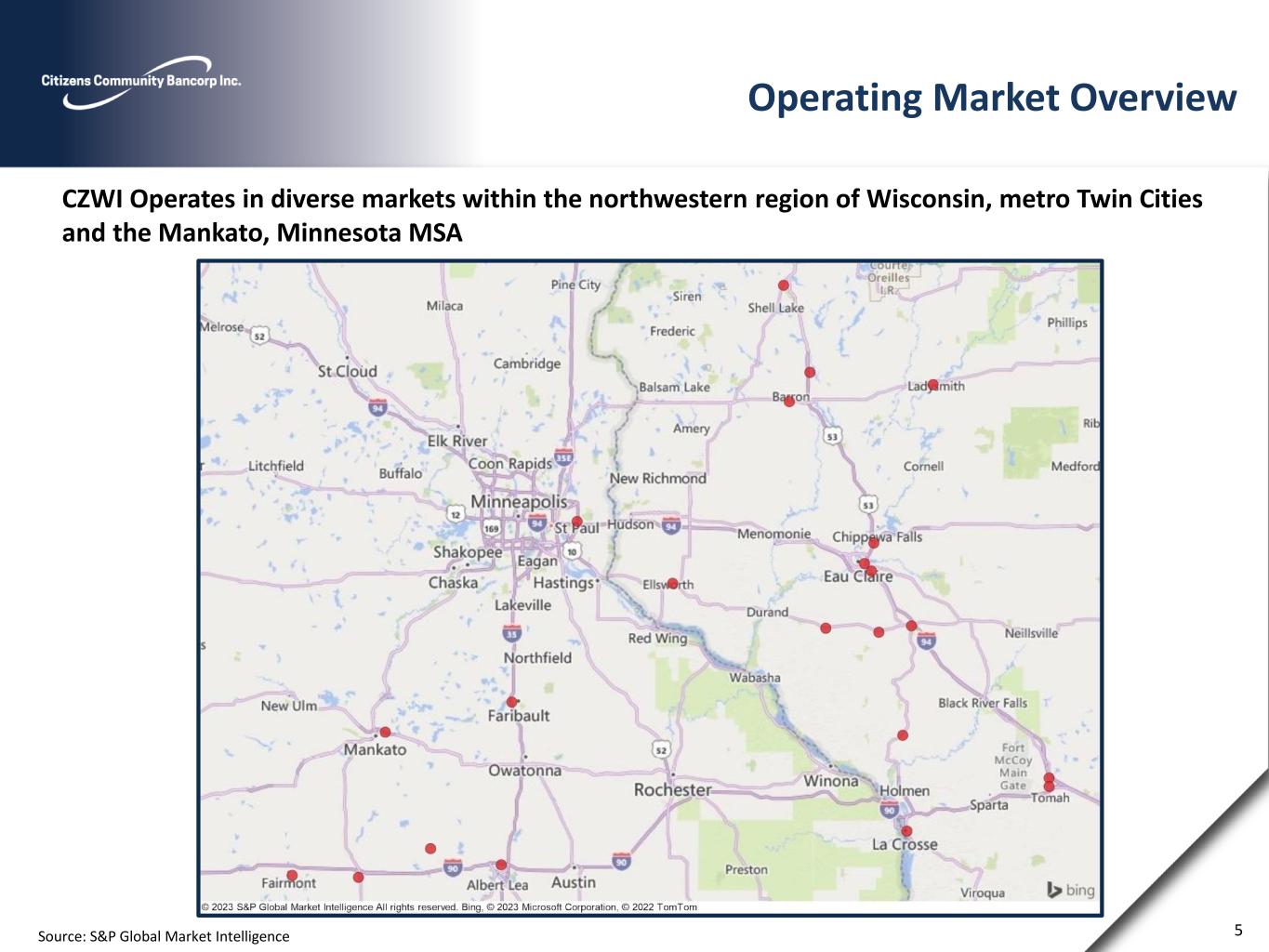 Operating Market Overview CZWI Operates in diverse markets within the northwestern region of Wisconsin, metro Twin Cities and the Mankato, Minnesota MSA Source: S&P Global Market Intelligence 0 0 0 0 0 5