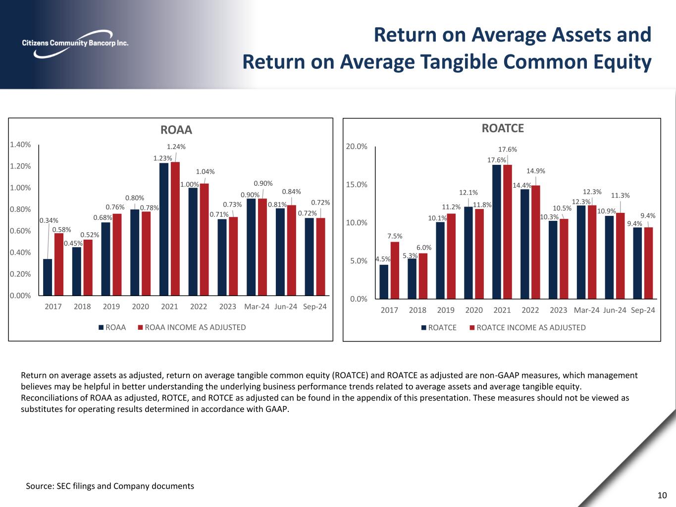 Book Value, Tangible Book Value and Core Net Revenue Detail Source: S&P Global Market Intelligence, company filings Tangible book value per share is a non-GAAP measure which management believes may be helpful in better assessing capital adequacy. The reconciliation of Tangible book value per share can be found in the appendix of this presentation. These measures should not be viewed as substitutes for operating results determined in accordance with GAAP. 9 $9.78 $11.05 $9.89 $11.18 $12.90 $12.77 $13.42 $13.43 $13.91 $14.64 $12.48 $12.46 $13.36 $14.52 $16.27 $16.03 $16.60 $16.61 $17.10 $17.88 $0.00 $5.00 $10.00 $15.00 $20.00 2017 FY 2018 FY 2019 FY 2020 FY 2021 FY 2022 FY 2023 FY Mar-24 Jun-24 Sep-24 BOOK VALUE AND TANGIBLE BOOK VALUE PER SHARE TANGIBLE BOOK VALUE PER SHARE BOOK VALUE PER SHARE $ 2 2 ,8 7 8 $ 2 9 ,7 6 4 $ 4 2 ,6 8 6 $ 4 3 ,6 7 3 $ 4 0 ,5 3 2 $ 4 1 ,7 4 3 $ 4 0 ,1 4 2 $ 3 1 ,4 9 7 $- $10,000 $20,000 $30,000 $40,000 $50,000 $60,000 $70,000 2017 2018 2019 2020 2021 2022 2023 2024 YTD CORE NET REVENUE DETAIL NET INTEREST INCOME NON-INTEREST INCOME NON-INTEREST EXPENSE $58,488 $68,703 $69,491 $42,864 $27,019 $37,673 $66,799 $58,599