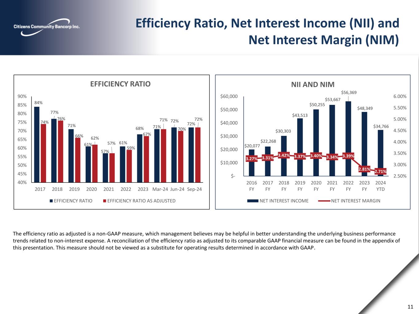Return on average assets as adjusted, return on average tangible common equity (ROATCE) and ROATCE as adjusted are non-GAAP measures, which management believes may be helpful in better understanding the underlying business performance trends related to average assets and average tangible equity. Reconciliations of ROAA as adjusted, ROTCE, and ROTCE as adjusted can be found in the appendix of this presentation. These measures should not be viewed as substitutes for operating results determined in accordance with GAAP. Return on Average Assets and Return on Average Tangible Common Equity Source: SEC filings and Company documents 10 0.34% 0.45% 0.68% 0.80% 1.23% 1.00% 0.71% 0.90% 0.81% 0.72% 0.58% 0.52% 0.76% 0.78% 1.24% 1.04% 0.73% 0.90% 0.84% 0.72% 0.00% 0.20% 0.40% 0.60% 0.80% 1.00% 1.20% 1.40% 2017 2018 2019 2020 2021 2022 2023 Mar-24 Jun-24 Sep-24 ROAA ROAA ROAA INCOME AS ADJUSTED 4.5% 5.3% 10.1% 12.1% 17.6% 14.4% 10.3% 12.3% 10.9% 9.4% 7.5% 6.0% 11.2% 11.8% 17.6% 14.9% 10.5% 12.3% 11.3% 9.4% 0.0% 5.0% 10.0% 15.0% 20.0% 2017 2018 2019 2020 2021 2022 2023 Mar-24 Jun-24 Sep-24 ROATCE ROATCE ROATCE INCOME AS ADJUSTED