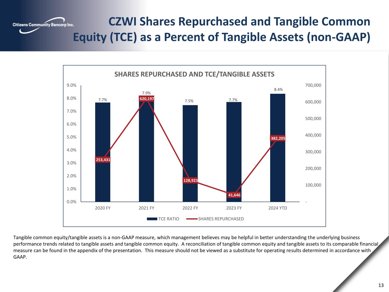 Citizens Community Bancorp, Inc. Capital Ratios 12 6.6% 8.3% 7.7% 7.7% 7.9% 8.5% 8.9% 8.9% 9.1% 9.1% 0.0% 2.0% 4.0% 6.0% 8.0% 10.0% LEVERAGE RATIO 8.9% 10.2% 9.1% 10.5% 9.7% 9.7% 10.3% 10.4% 10.7% 10.8% 0.0% 4.0% 8.0% 12.0% COMMON EQUITY TIER 1 RATIO 12.0% 12.4% 11.2% 14.3% 13.1% 14.0% 14.7% 14.9% 15.2% 15.3% 0.0% 4.0% 8.0% 12.0% 16.0% TOTAL CAPITAL RATIO Tangible common equity/tangible assets is a non-GAAP measure, which management believes may be helpful in better understanding the underlying business performance trends related to tangible assets and tangible common equity. A reconciliation of tangible common equity and tangible assets to its comparable financial measure can be found in the appendix of the presentation. This measure should not be viewed as a substitute for operating results determined in accordance with GAAP. 6.3% 7.9% 7.5% 7.7% 7.9% 7.5% 7.7% 7.8% 8.1% 8.4% 0.0% 2.0% 4.0% 6.0% 8.0% 10.0% TANGIBLE COMMON EQUITY / TANGIBLE ASSETS