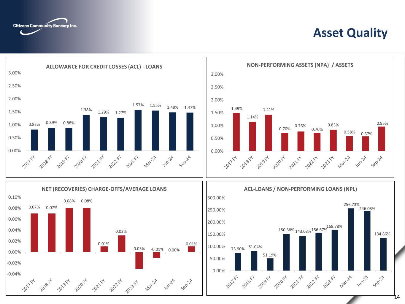 CZWI Shares Repurchased and Tangible Common Equity (TCE) as a Percent of Tangible Assets (non-GAAP) Tangible common equity/tangible assets is a non-GAAP measure, which management believes may be helpful in better understanding the underlying business performance trends related to tangible assets and tangible common equity. A reconciliation of tangible common equity and tangible assets to its comparable financial measure can be found in the appendix of the presentation. This measure should not be viewed as a substitute for operating results determined in accordance with GAAP. 13 7.7% 7.9% 7.5% 7.7% 8.4% 253,431 620,197 128,923 41,646 382,205 - 100,000 200,000 300,000 400,000 500,000 600,000 700,000 0.0% 1.0% 2.0% 3.0% 4.0% 5.0% 6.0% 7.0% 8.0% 9.0% 2020 FY 2021 FY 2022 FY 2023 FY 2024 YTD SHARES REPURCHASED AND TCE/TANGIBLE ASSETS TCE RATIO SHARES REPURCHASED
