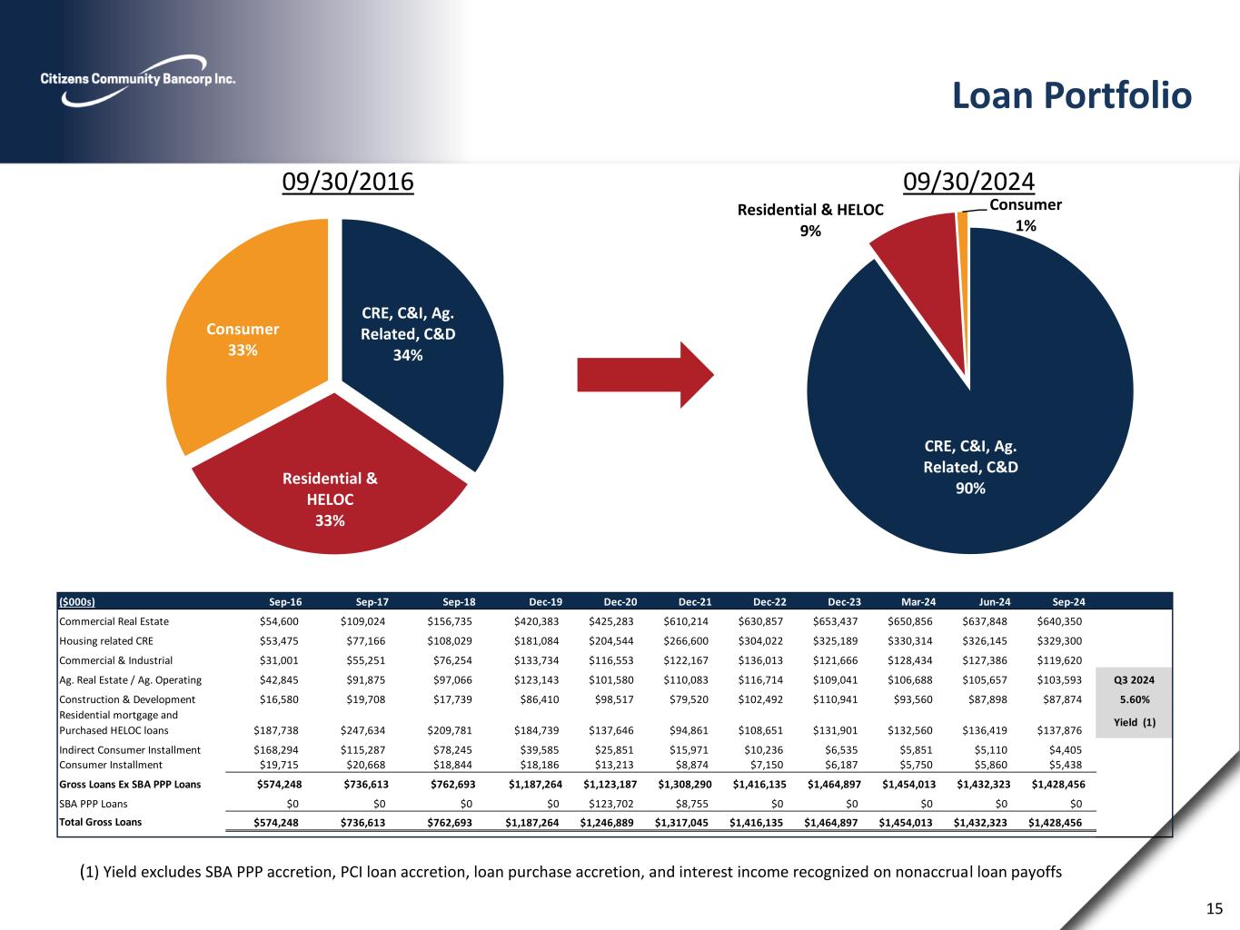 CRE, C&I, Ag. Related, C&D 90% Residential & HELOC 9% Consumer 1% Loan Portfolio 09/30/2016 09/30/2024 CRE, C&I, Ag. Related, C&D 34% Residential & HELOC 33% Consumer 33% 15 (1) Yield excludes SBA PPP accretion, PCI loan accretion, loan purchase accretion, and interest income recognized on nonaccrual loan payoffs ($000s) Sep-16 Sep-17 Sep-18 Dec-19 Dec-20 Dec-21 Dec-22 Dec-23 Mar-24 Jun-24 Sep-24 Commercial Real Estate $54,600 $109,024 $156,735 $420,383 $425,283 $610,214 $630,857 $653,437 $650,856 $637,848 $640,350 Housing related CRE $53,475 $77,166 $108,029 $181,084 $204,544 $266,600 $304,022 $325,189 $330,314 $326,145 $329,300 Commercial & Industrial $31,001 $55,251 $76,254 $133,734 $116,553 $122,167 $136,013 $121,666 $128,434 $127,386 $119,620 Ag. Real Estate / Ag. Operating $42,845 $91,875 $97,066 $123,143 $101,580 $110,083 $116,714 $109,041 $106,688 $105,657 $103,593 Q3 2024 Construction & Development $16,580 $19,708 $17,739 $86,410 $98,517 $79,520 $102,492 $110,941 $93,560 $87,898 $87,874 5.60% Residential mortgage and Purchased HELOC loans $187,738 $247,634 $209,781 $184,739 $137,646 $94,861 $108,651 $131,901 $132,560 $136,419 $137,876 Yield (1) Indirect Consumer Installment $168,294 $115,287 $78,245 $39,585 $25,851 $15,971 $10,236 $6,535 $5,851 $5,110 $4,405 Consumer Installment $19,715 $20,668 $18,844 $18,186 $13,213 $8,874 $7,150 $6,187 $5,750 $5,860 $5,438 Gross Loans Ex SBA PPP Loans $574,248 $736,613 $762,693 $1,187,264 $1,123,187 $1,308,290 $1,416,135 $1,464,897 $1,454,013 $1,432,323 $1,428,456 SBA PPP Loans $0 $0 $0 $0 $123,702 $8,755 $0 $0 $0 $0 $0 Total Gross Loans $574,248 $736,613 $762,693 $1,187,264 $1,246,889 $1,317,045 $1,416,135 $1,464,897 $1,454,013 $1,432,323 $1,428,456