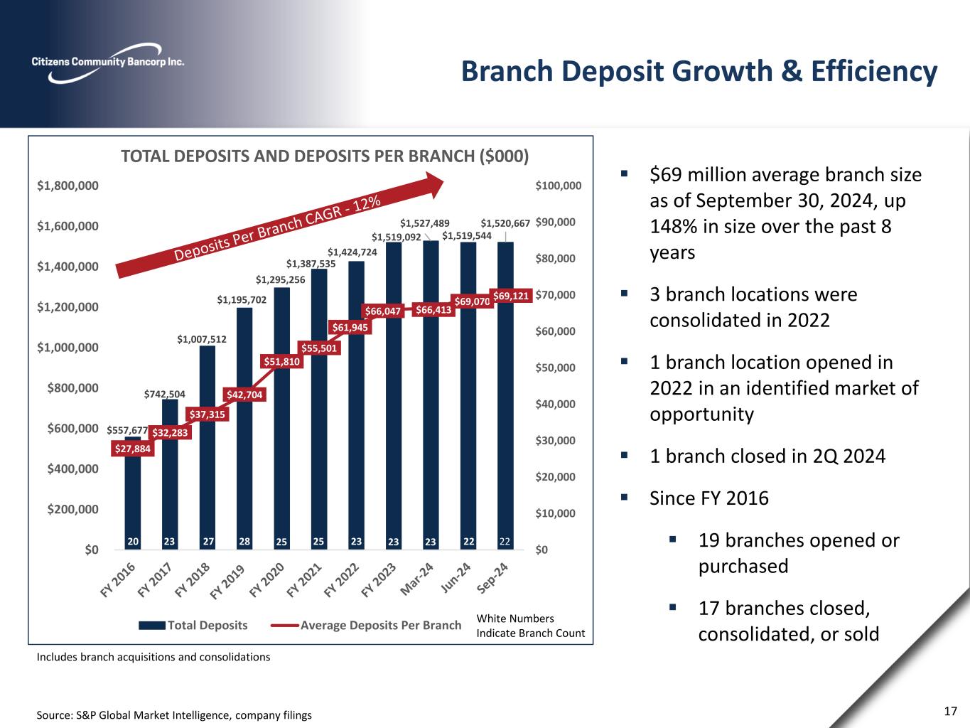 Deposit Composition ▪ Focus has been on transforming the deposit composition to core deposits ▪ Deposit transformation and growth has been achieved through both acquisitions and organic initiatives 9/30/2016 09/30/2024 Source: S&P Global Market Intelligence, company filings Non Interest Bearing Demand 8% Interest Bearing Demand 9% MMDA & Savings 34% CDs 49% 16 Non Interest Bearing Demand 17% Interest Bearing Demand 23% MMDA & Savings 35% CDs 25% ($000) Sep-16 Sep-17 Sep-18 Dec-19 Dec-20 Dec-21 Dec-22 Dec-23 Mar-24 Jun-24 Sep-24 Non-interest-bearing demand deposits $45,408 $75,318 $87,495 $168,157 $238,348 $276,631 $284,726 $265,704 $248,537 $255,703 $256,840 Interest bearing demand deposits $48,934 $147,912 $139,276 $223,102 $301,764 $396,231 $371,210 $343,276 $361,278 $353,477 $346,971 Q3 2024 Savings accounts $52,153 $102,756 $97,329 $156,599 $196,348 $222,674 $220,019 $176,548 $177,595 $170,946 $169,096 Cost of Deposits Money market accounts $137,234 $125,749 $109,314 $246,430 $245,549 $288,985 $323,435 $374,055 $387,879 $370,164 $366,067 2.63% Certificate accounts $273,948 $290,769 $313,115 $401,414 $313,247 $203,014 $225,334 $359,509 $352,200 $369,254 $381,693 Total Deposits $557,677 $742,504 $746,529 $1,195,702 $1,295,256 $1,387,535 $1,424,724 $1,519,092 $1,527,489 $1,519,544 $1,520,667 Deposit Composition - Quarter Lookback