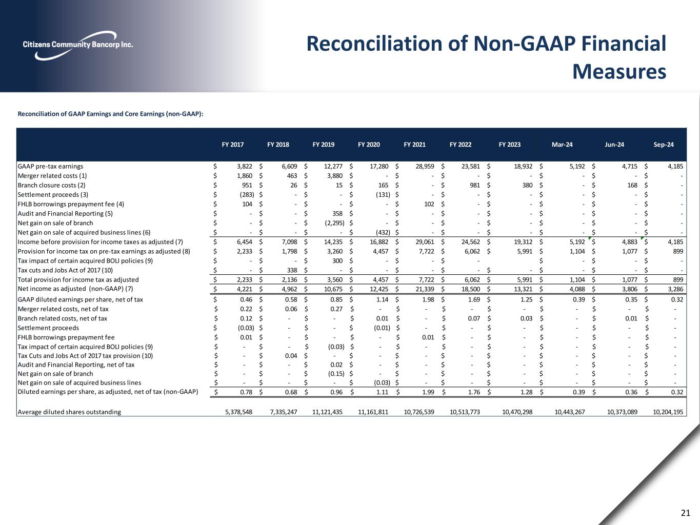 (1) All costs incurred are presented as professional fees and other non-interest expense in the consolidated statement of operations and include costs $0, $0, $0, $0, $0, $0, $0, $341,000, $350,000, and $565,000 for the three months ended September 30, 2024, June 30, 2024, and March 31, 2024, and years ended December 31, 2023, December 31, 2022, December 31, 2021, December 31, 2020, December 31, 2019, September 30, 2018, and September 30, 2017, respectively, which are nondeductible expenses for federal income tax purposes. (2) Branch closure costs include severance pay recorded in compensation and benefits, accelerated depreciation expense and lease termination fees included in occupancy and other costs included in other non-interest expense in the consolidated statement of operations. In addition, other non-interest expense includes costs related to the reduction in valuation of a closed branch office in the fourth quarter of fiscal 2017 and costs associated with three branch closures during the quarter ended December 31, 2020, one branch closure in the quarter ended September 30, 2022, two branch closures in the quarter ended December 31, 2022, and one branch office closure in the quarter ended December 31, 2023. Professional services includes legal costs related to the sale of the Michigan branch included in these Branch closure costs during the quarter ended March 31, 2019. (3) Settlement proceeds includes litigation income from a JP Morgan Residential Mortgage-Backed Security (RMBS) claim. This JP Morgan RMBS was previously owned by the Bank and sold in 2011. (4) The prepayment fee to restructure our FHLB borrowings is included in other non-interest expense in the consolidated statement of operations. (5) Audit and financial reporting costs include additional audit and professional fees related to the change in our year end from September 30 to December 31, effective December 31, 2018. (6) Net gain on sale of acquired business lines resulted from (1) the sale of Wells Insurance Agency and (2) the termination and sale of the wealth management business line sales contract acquired in a former acquisition. (7) Pretax net income as adjusted and net income as adjusted are non-GAAP measures that management believes enhances the market’s ability to assess the underlying business performance and trends related to core business activities. (8) Provision for income tax on pre-tax income as adjusted is calculated at our effective tax rate for each respective period presented. (9) Tax impact of certain acquired BOLI policies from United Bank. (10) As a result of the Tax Cuts and Jobs Act of 2017, we recorded a one-time net tax provision of $338,000 in 2018, which is included in provision for income taxes expense in the consolidated statement of operations. 22 Reconciliation of Non-GAAP Financial Measures