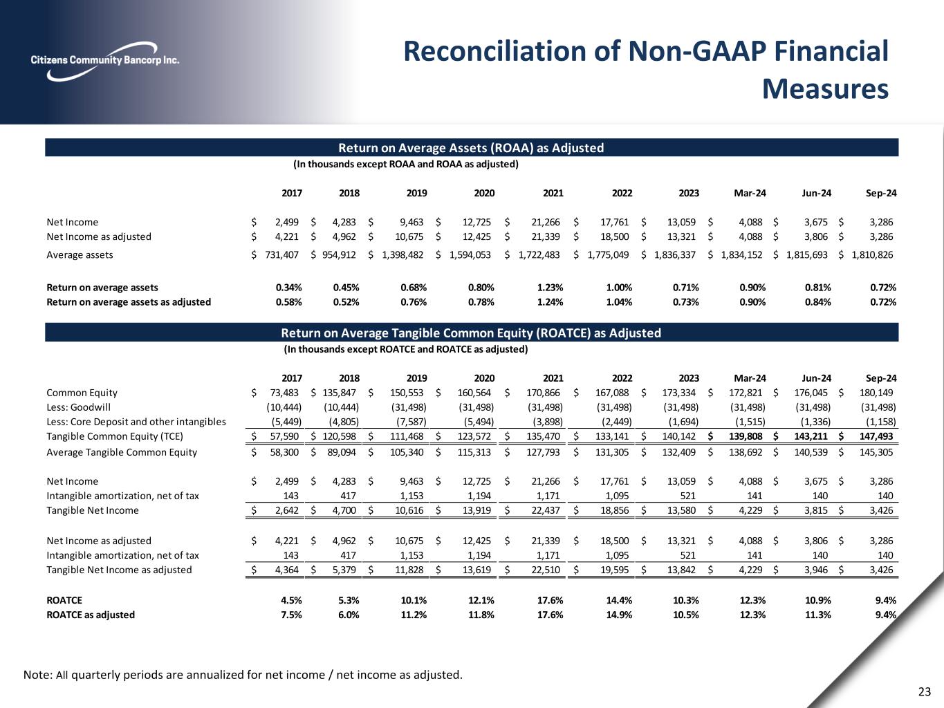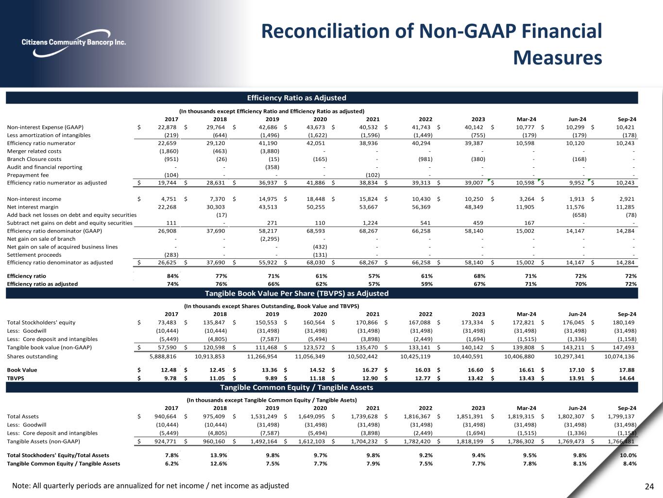 Reconciliation of Non-GAAP Financial Measures Note: All quarterly periods are annualized for net income / net income as adjusted 24 2017 2018 2019 2020 2021 2022 2023 Mar-24 Jun-24 Sep-24 Non-interest Expense (GAAP) 22,878$ 29,764$ 42,686$ 43,673$ 40,532$ 41,743$ 40,142$ 10,777$ 10,299$ 10,421$ Less amortization of intangibles (219) (644) (1,496) (1,622) (1,596) (1,449) (755) (179) (179) (178) Efficiency ratio numerator 22,659 29,120 41,190 42,051 38,936 40,294 39,387 10,598 10,120 10,243 Merger related costs (1,860) (463) (3,880) - - - - - - - Branch Closure costs (951) (26) (15) (165) - (981) (380) - (168) - Audit and financial reporting - - (358) - - - - - - - Prepayment fee (104) - - - (102) - - - - - Efficiency ratio numerator as adjusted 19,744$ 28,631$ 36,937$ 41,886$ 38,834$ 39,313$ 39,007$ 10,598$ 9,952$ 10,243$ Non-interest income 4,751$ 7,370$ 14,975$ 18,448$ 15,824$ 10,430$ 10,250$ 3,264$ 1,913$ 2,921$ Net interest margin 22,268 30,303 43,513 50,255 53,667 56,369 48,349 11,905 11,576 11,285 Add back net losses on debt and equity securities (17) (658) (78) Subtract net gains on debt and equity securities 111 - 271 110 1,224 541 459 167 - - Efficiency ratio denominator (GAAP) 26,908 37,690 58,217 68,593 68,267 66,258 58,140 15,002 14,147 14,284 Net gain on sale of branch - - (2,295) - - - - - - - Net gain on sale of acquired business lines - - - (432) - - - - - - Settlement proceeds (283) - - (131) - - - - - - Efficiency ratio denominator as adjusted 26,625$ 37,690$ 55,922$ 68,030$ 68,267$ 66,258$ 58,140$ 15,002$ 14,147$ 14,284$ Efficiency ratio 84% 77% 71% 61% 57% 61% 68% 71% 72% 72% Efficiency ratio as adjusted 74% 76% 66% 62% 57% 59% 67% 71% 70% 72% 2017 2018 2019 2020 2021 2022 2023 Mar-24 Jun-24 Sep-24 Total Stockholders' equity 73,483$ 135,847$ 150,553$ 160,564$ 170,866$ 167,088$ 173,334$ 172,821$ 176,045$ 180,149$ Less: Goodwill (10,444) (10,444) (31,498) (31,498) (31,498) (31,498) (31,498) (31,498) (31,498) (31,498) Less: Core deposit and intangibles (5,449) (4,805) (7,587) (5,494) (3,898) (2,449) (1,694) (1,515) (1,336) (1,158) Tangible book value (non-GAAP) 57,590$ 120,598$ 111,468$ 123,572$ 135,470$ 133,141$ 140,142$ 139,808$ 143,211$ 147,493$ Shares outstanding 5,888,816 10,913,853 11,266,954 11,056,349 10,502,442 10,425,119 10,440,591 10,406,880 10,297,341 10,074,136 Book Value 12.48$ 12.45$ 13.36$ 14.52$ 16.27$ 16.03$ 16.60$ 16.61$ 17.10$ 17.88$ TBVPS 9.78$ 11.05$ 9.89$ 11.18$ 12.90$ 12.77$ 13.42$ 13.43$ 13.91$ 14.64$ 2017 2018 2019 2020 2021 2022 2023 Mar-24 Jun-24 Sep-24 Total Assets 940,664$ 975,409$ 1,531,249$ 1,649,095$ 1,739,628$ 1,816,367$ 1,851,391$ 1,819,315$ 1,802,307$ 1,799,137$ Less: Goodwill (10,444) (10,444) (31,498) (31,498) (31,498) (31,498) (31,498) (31,498) (31,498) (31,498) Less: Core deposit and intangibles (5,449) (4,805) (7,587) (5,494) (3,898) (2,449) (1,694) (1,515) (1,336) (1,158) Tangible Assets (non-GAAP) 924,771$ 960,160$ 1,492,164$ 1,612,103$ 1,704,232$ 1,782,420$ 1,818,199$ 1,786,302$ 1,769,473$ 1,766,481$ Total Stockhoders' Equity/Total Assets 7.8% 13.9% 9.8% 9.7% 9.8% 9.2% 9.4% 9.5% 9.8% 10.0% Tangible Common Equity / Tangible Assets 6.2% 12.6% 7.5% 7.7% 7.9% 7.5% 7.7% 7.8% 8.1% 8.4% (In thousands except Tangible Common Equity / Tangible Asets) (In thousands except Shares Outstanding, Book Value and TBVPS) (In thousands except Efficiency Ratio and Efficiency Ratio as adjusted) Efficiency Ratio as Adjusted Tangible Book Value Per Share (TBVPS) as Adjusted Tangible Common Equity / Tangible Assets