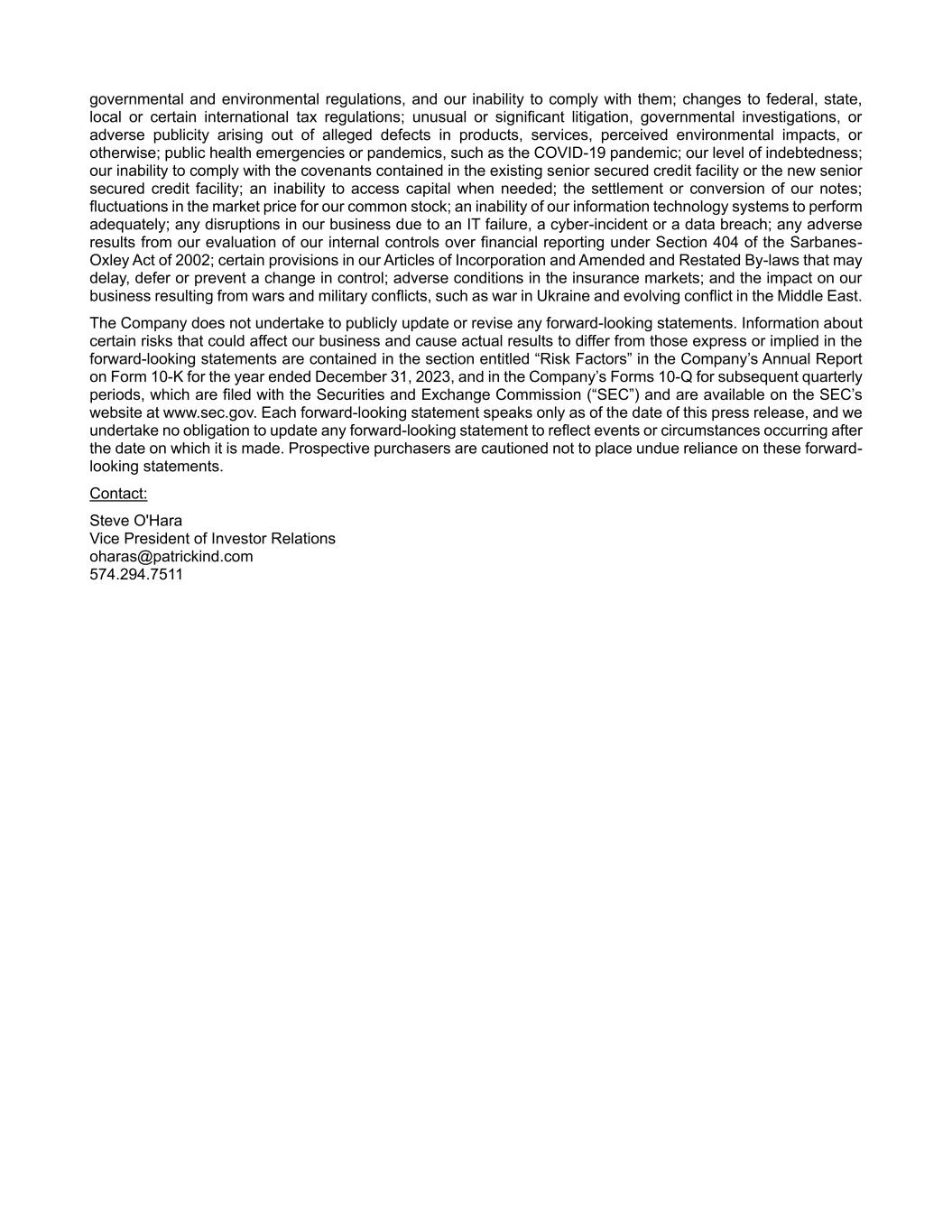 governmental and environmental regulations, and our inability to comply with them; changes to federal, state, local or certain international tax regulations; unusual or significant litigation, governmental investigations, or adverse publicity arising out of alleged defects in products, services, perceived environmental impacts, or otherwise; public health emergencies or pandemics, such as the COVID-19 pandemic; our level of indebtedness; our inability to comply with the covenants contained in the existing senior secured credit facility or the new senior secured credit facility; an inability to access capital when needed; the settlement or conversion of our notes; fluctuations in the market price for our common stock; an inability of our information technology systems to perform adequately; any disruptions in our business due to an IT failure, a cyber-incident or a data breach; any adverse results from our evaluation of our internal controls over financial reporting under Section 404 of the Sarbanes- Oxley Act of 2002; certain provisions in our Articles of Incorporation and Amended and Restated By-laws that may delay, defer or prevent a change in control; adverse conditions in the insurance markets; and the impact on our business resulting from wars and military conflicts, such as war in Ukraine and evolving conflict in the Middle East. The Company does not undertake to publicly update or revise any forward-looking statements. Information about certain risks that could affect our business and cause actual results to differ from those express or implied in the forward-looking statements are contained in the section entitled “Risk Factors” in the Company’s Annual Report on Form 10-K for the year ended December 31, 2023, and in the Company’s Forms 10-Q for subsequent quarterly periods, which are filed with the Securities and Exchange Commission (“SEC”) and are available on the SEC’s website at www.sec.gov. Each forward-looking statement speaks only as of the date of this press release, and we undertake no obligation to update any forward-looking statement to reflect events or circumstances occurring after the date on which it is made. Prospective purchasers are cautioned not to place undue reliance on these forward- looking statements. Contact: Steve O'Hara Vice President of Investor Relations oharas@patrickind.com 574.294.7511