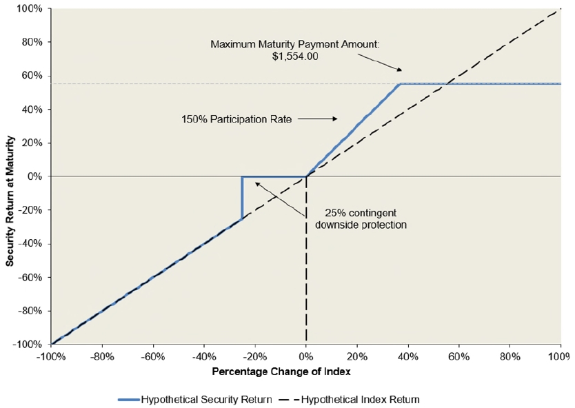 | n | If the level of the Index increases, you will receive the face amount plus a positive return equal to 150% of the percentage increase in the level of the Index from the starting level, subject to a maximum return at maturity of at least 55.40% (to be determined on the pricing date) of the face amount. As a result of the maximum return, the maximum maturity payment amount will be at least $1,554.00 |