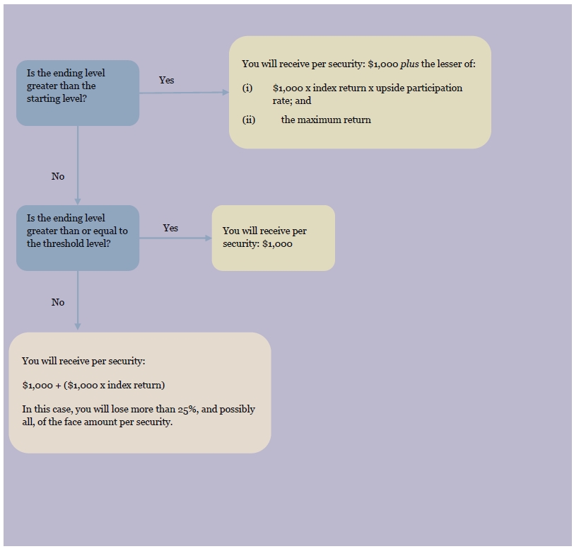 | § | are willing to accept the risk that, if the ending level is less than the starting level by more than 25%, they will be fully exposed to the decrease in the level of the Index from the starting level, and will lose more than 25%, and possibly all, of the face amount per security at maturity; |