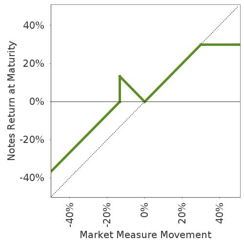 This graph reflects the returns on the notes, based on the Participation Rate of 100.00%, the Threshold Value of 86.70% and the Capped Value of $13.00 per unit. The green line reflects the returns on the notes, while the dotted gray line reflects the returns of a direct investment in the securities included in the Basket Components, excluding dividends.