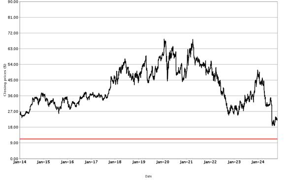 The following graph sets forth historical closing values of the Underlier for the period from January 1, 2014 to October 25, 2024. The red line represents the Coupon Threshold and Barrier Value. We obtained the information in the graph from Bloomberg Financial Markets, without independent investigation. We cannot give you assurance that the performance of the Underlier will result in the return of all of your initial investment.