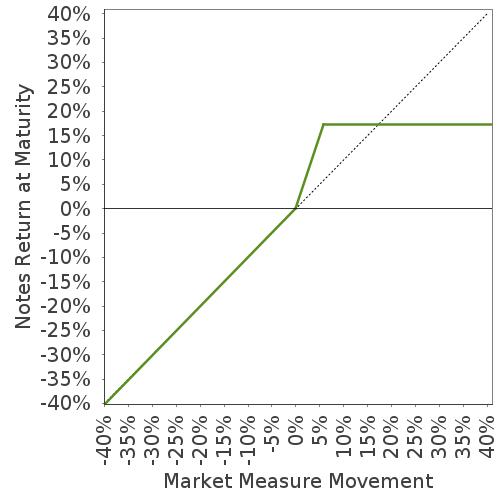 This graph reflects the returns on the notes, based on the Participation Rate of 300% and the Capped Value of $11.722 per unit. The green line reflects the returns on the notes, while the dotted gray line reflects the returns of a direct investment in the securities included in the Basket Components, excluding dividends.