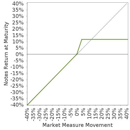 This graph reflects the returns on the notes, based on the Participation Rate of 300% and the Capped Value of $11.175 per unit. The green line reflects the returns on the notes, while the dotted gray line reflects the returns of a direct investment in the Market Measure, excluding dividends.