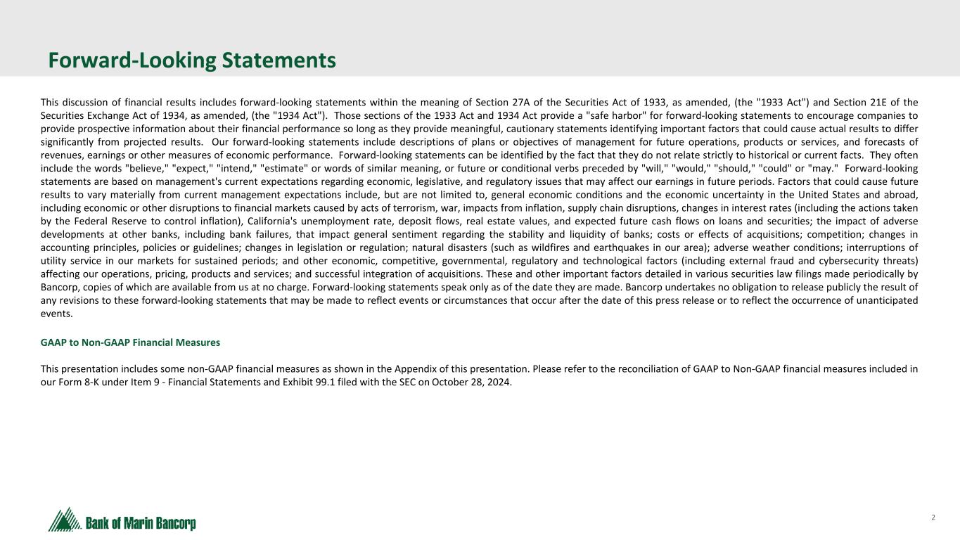 2 Text 95,96,96 Light Gray 232, 232, 232 Black 0, 0, 0 White 255, 255, 255 Accent 1 7,89,52 Accent 2 248,153,40 Accent 3 254,217,129 Accent 4 52,153,70 Accent 5 5,39,67 Accent 6 171,184,195 Forward-Looking Statements This discussion of financial results includes forward-looking statements within the meaning of Section 27A of the Securities Act of 1933, as amended, (the "1933 Act") and Section 21E of the Securities Exchange Act of 1934, as amended, (the "1934 Act"). Those sections of the 1933 Act and 1934 Act provide a "safe harbor" for forward-looking statements to encourage companies to provide prospective information about their financial performance so long as they provide meaningful, cautionary statements identifying important factors that could cause actual results to differ significantly from projected results. Our forward-looking statements include descriptions of plans or objectives of management for future operations, products or services, and forecasts of revenues, earnings or other measures of economic performance. Forward-looking statements can be identified by the fact that they do not relate strictly to historical or current facts. They often include the words "believe," "expect," "intend," "estimate" or words of similar meaning, or future or conditional verbs preceded by "will," "would," "should," "could" or "may." Forward-looking statements are based on management's current expectations regarding economic, legislative, and regulatory issues that may affect our earnings in future periods. Factors that could cause future results to vary materially from current management expectations include, but are not limited to, general economic conditions and the economic uncertainty in the United States and abroad, including economic or other disruptions to financial markets caused by acts of terrorism, war, impacts from inflation, supply chain disruptions, changes in interest rates (including the actions taken by the Federal Reserve to control inflation), California's unemployment rate, deposit flows, real estate values, and expected future cash flows on loans and securities; the impact of adverse developments at other banks, including bank failures, that impact general sentiment regarding the stability and liquidity of banks; costs or effects of acquisitions; competition; changes in accounting principles, policies or guidelines; changes in legislation or regulation; natural disasters (such as wildfires and earthquakes in our area); adverse weather conditions; interruptions of utility service in our markets for sustained periods; and other economic, competitive, governmental, regulatory and technological factors (including external fraud and cybersecurity threats) affecting our operations, pricing, products and services; and successful integration of acquisitions. These and other important factors detailed in various securities law filings made periodically by Bancorp, copies of which are available from us at no charge. Forward-looking statements speak only as of the date they are made. Bancorp undertakes no obligation to release publicly the result of any revisions to these forward-looking statements that may be made to reflect events or circumstances that occur after the date of this press release or to reflect the occurrence of unanticipated events. GAAP to Non-GAAP Financial Measures This presentation includes some non-GAAP financial measures as shown in the Appendix of this presentation. Please refer to the reconciliation of GAAP to Non-GAAP financial measures included in our Form 8-K under Item 9 - Financial Statements and Exhibit 99.1 filed with the SEC on October 28, 2024.