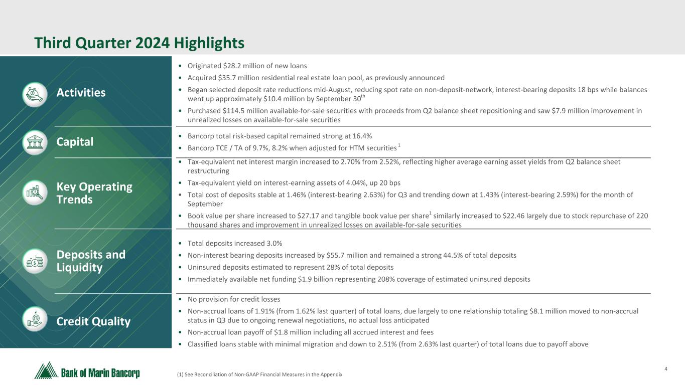 3 Text 95,96,96 Light Gray 232, 232, 232 Black 0, 0, 0 White 255, 255, 255 Accent 1 7,89,52 Accent 2 248,153,40 Accent 3 254,217,129 Accent 4 52,153,70 Accent 5 5,39,67 Accent 6 171,184,195 Bank of Marin Bancorp Novato, CA Headquarters BMRC NASDAQ $323.1 Million Market Cap $3.8 Billion Total Assets 4.98% Dividend Yield 16.40% Total RBC BMRC AT A GLANCE O P T I O N 2 Data as of 9/30/24 Relationship Banking Build strong, long-term customer relationships based on trust, integrity and expertise, inspiring loyalty though exceptional service. Disciplined Fundamentals Apply a disciplined business approach with sound banking practices, high quality products, and consistent fundamentals ensuring continued strong results. Community Commitment Give back to the communities that we serve through active employee volunteerism, nonprofit board leadership and financial contributions. 27 Branch Locations 7 Commercial Banking Offices
