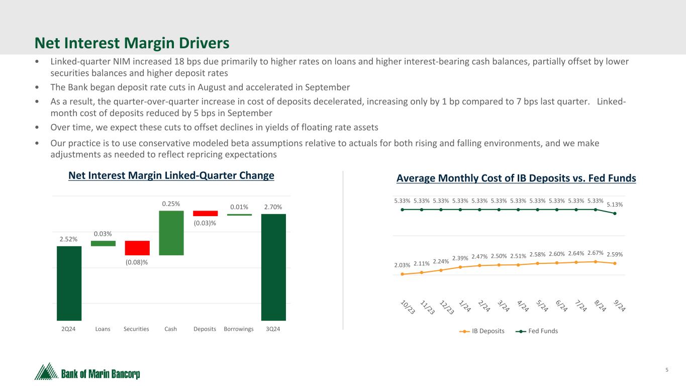 4 Text 95,96,96 Light Gray 232, 232, 232 Black 0, 0, 0 White 255, 255, 255 Accent 1 7,89,52 Accent 2 248,153,40 Accent 3 254,217,129 Accent 4 52,153,70 Accent 5 5,39,67 Accent 6 171,184,195 Third Quarter 2024 Highlights (1) See Reconciliation of Non-GAAP Financial Measures in the Appendix Activities • Originated $28.2 million of new loans • Acquired $35.7 million residential real estate loan pool, as previously announced • Began selected deposit rate reductions mid-August, reducing spot rate on non-deposit-network, interest-bearing deposits 18 bps while balances went up approximately $10.4 million by September 30th • Purchased $114.5 million available-for-sale securities with proceeds from Q2 balance sheet repositioning and saw $7.9 million improvement in unrealized losses on available-for-sale securities Capital • Bancorp total risk-based capital remained strong at 16.4% • Bancorp TCE / TA of 9.7%, 8.2% when adjusted for HTM securities 1 Key Operating Trends • Tax-equivalent net interest margin increased to 2.70% from 2.52%, reflecting higher average earning asset yields from Q2 balance sheet restructuring • Tax-equivalent yield on interest-earning assets of 4.04%, up 20 bps • Total cost of deposits stable at 1.46% (interest-bearing 2.63%) for Q3 and trending down at 1.43% (interest-bearing 2.59%) for the month of September • Book value per share increased to $27.17 and tangible book value per share1 similarly increased to $22.46 largely due to stock repurchase of 220 thousand shares and improvement in unrealized losses on available-for-sale securities Deposits and Liquidity • Total deposits increased 3.0% • Non-interest bearing deposits increased by $55.7 million and remained a strong 44.5% of total deposits • Uninsured deposits estimated to represent 28% of total deposits • Immediately available net funding $1.9 billion representing 208% coverage of estimated uninsured deposits Credit Quality • No provision for credit losses • Non-accrual loans of 1.91% (from 1.62% last quarter) of total loans, due largely to one relationship totaling $8.1 million moved to non-accrual status in Q3 due to ongoing renewal negotiations, no actual loss anticipated • Non-accrual loan payoff of $1.8 million including all accrued interest and fees • Classified loans stable with minimal migration and down to 2.51% (from 2.63% last quarter) of total loans due to payoff above