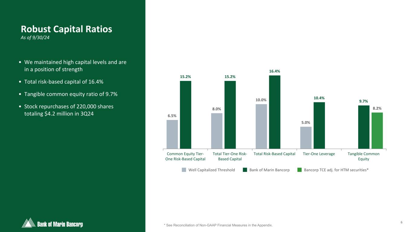 5 Text 95,96,96 Light Gray 232, 232, 232 Black 0, 0, 0 White 255, 255, 255 Accent 1 7,89,52 Accent 2 248,153,40 Accent 3 254,217,129 Accent 4 52,153,70 Accent 5 5,39,67 Accent 6 171,184,195 • Linked-quarter NIM increased 18 bps due primarily to higher rates on loans and higher interest-bearing cash balances, partially offset by lower securities balances and higher deposit rates • The Bank began deposit rate cuts in August and accelerated in September • As a result, the quarter-over-quarter increase in cost of deposits decelerated, increasing only by 1 bp compared to 7 bps last quarter. Linked- month cost of deposits reduced by 5 bps in September • Over time, we expect these cuts to offset declines in yields of floating rate assets • Our practice is to use conservative modeled beta assumptions relative to actuals for both rising and falling environments, and we make adjustments as needed to reflect repricing expectations Net Interest Margin Drivers 2.52% 0.03% (0.08)% 0.25% (0.03)% 0.01% 2.70% 2Q24 Loans Securities Cash Deposits Borrowings 3Q24 Net Interest Margin Linked-Quarter Change 2.03% 2.11% 2.24% 2.39% 2.47% 2.50% 2.51% 2.58% 2.60% 2.64% 2.67% 2.59% 5.33% 5.33% 5.33% 5.33% 5.33% 5.33% 5.33% 5.33% 5.33% 5.33% 5.33% 5.13% IB Deposits Fed Funds 10/23 11/23 12/23 1/24 2/24 3/24 4/24 5/24 6/24 7/24 8/24 9/24 Average Monthly Cost of IB Deposits vs. Fed Funds