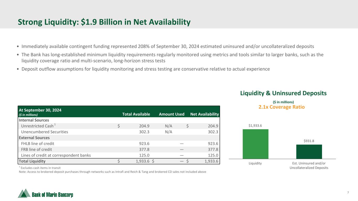6 Text 95,96,96 Light Gray 232, 232, 232 Black 0, 0, 0 White 255, 255, 255 Accent 1 7,89,52 Accent 2 248,153,40 Accent 3 254,217,129 Accent 4 52,153,70 Accent 5 5,39,67 Accent 6 171,184,195 Robust Capital Ratios As of 9/30/24 • We maintained high capital levels and are in a position of strength • Total risk-based capital of 16.4% • Tangible common equity ratio of 9.7% • Stock repurchases of 220,000 shares totaling $4.2 million in 3Q24 * See Reconciliation of Non-GAAP Financial Measures in the Appendix. 6.5% 8.0% 10.0% 5.0% 15.2% 15.2% 16.4% 10.4% 9.7% 8.2% Well Capitalized Threshold Bank of Marin Bancorp Bancorp TCE adj. for HTM securities* Common Equity Tier- One Risk-Based Capital Total Tier-One Risk- Based Capital Total Risk-Based Capital Tier-One Leverage Tangible Common Equity