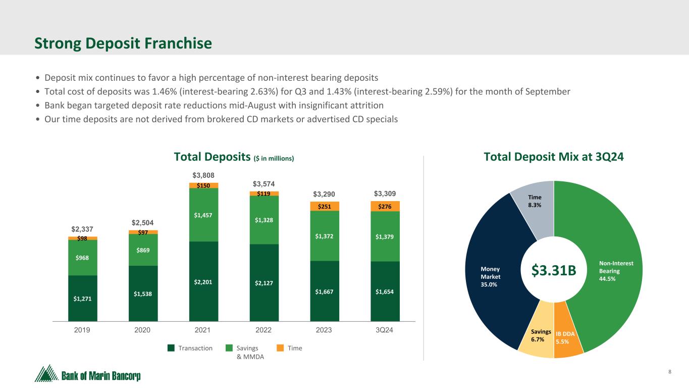 7 Text 95,96,96 Light Gray 232, 232, 232 Black 0, 0, 0 White 255, 255, 255 Accent 1 7,89,52 Accent 2 248,153,40 Accent 3 254,217,129 Accent 4 52,153,70 Accent 5 5,39,67 Accent 6 171,184,195 Strong Liquidity: $1.9 Billion in Net Availability • Immediately available contingent funding represented 208% of September 30, 2024 estimated uninsured and/or uncollateralized deposits • The Bank has long-established minimum liquidity requirements regularly monitored using metrics and tools similar to larger banks, such as the liquidity coverage ratio and multi-scenario, long-horizon stress tests • Deposit outflow assumptions for liquidity monitoring and stress testing are conservative relative to actual experience Liquidity & Uninsured Deposits ($ in millions) 2.1x Coverage Ratio At September 30, 2024 ($ in millions) Total Available Amount Used Net Availability Internal Sources Unrestricted Cash 1 $ 204.9 N/A $ 204.9 Unencumbered Securities 302.3 N/A 302.3 External Sources FHLB line of credit 923.6 — 923.6 FRB line of credit 377.8 — 377.8 Lines of credit at correspondent banks 125.0 — 125.0 Total Liquidity $ 1,933.6 $ — $ 1,933.6 1 Excludes cash items in transit Note: Access to brokered deposit purchases through networks such as Intrafi and Reich & Tang and brokered CD sales not included above $1,933.6 $931.8 Liquidity Est. Uninsured and/or Uncollateralized Deposits