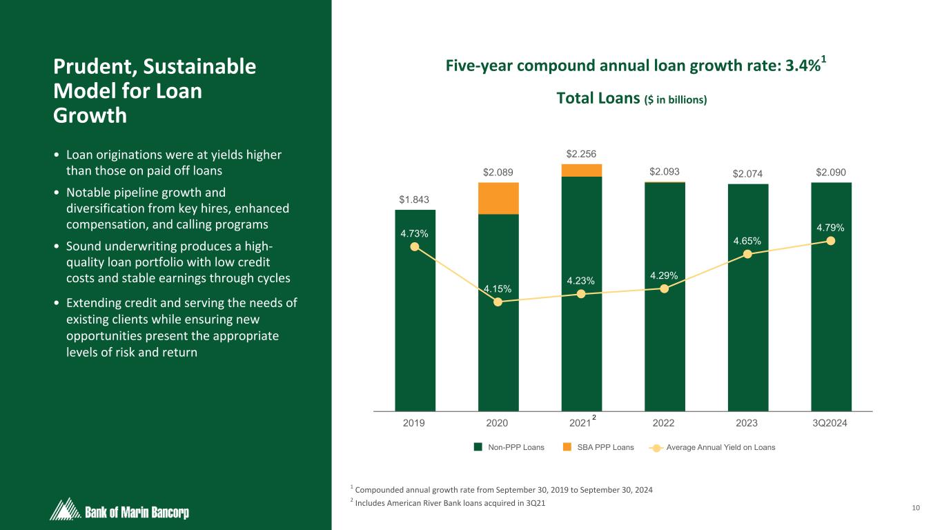 9 Text 95,96,96 Light Gray 232, 232, 232 Black 0, 0, 0 White 255, 255, 255 Accent 1 7,89,52 Accent 2 248,153,40 Accent 3 254,217,129 Accent 4 52,153,70 Accent 5 5,39,67 Accent 6 171,184,195 • 48% of new accounts consisted of new relationships to the Bank • 59% of new accounts were non-interest bearing by count • 71% of new accounts were interest- bearing in dollars at a weighted average rate of 2.76% • Reciprocal deposit network program (expanded FDIC insurance products) utilization increased notionally by $30.9 million New Accounts Mix (by count) 3Q24Granular Deposit Account Composition Existing Relationships - New $ 18% Account Migration 34% New Relationships 48% 1,182 (in thousands; except for # of Accounts) Interest Bearing Non-Interest Bearing Total Consumer Account Balances $ 971,581 $ 334,178 $ 1,305,759 # of Accounts 15,363 17,544 32,907 Avg Balance Per Account $ 63 $ 19 $ 40 Business Account Balances $ 863,552 $ 1,133,147 $ 1,996,699 # of Accounts 3,764 11,465 15,229 Avg Balance Per Account $ 229 $ 99 $ 131 *Excludes internal operating accounts such as holding company cash and deposit settlement accounts totaling $6.8 million Deposit Accounts Mix - Consumer vs Business 3Q24