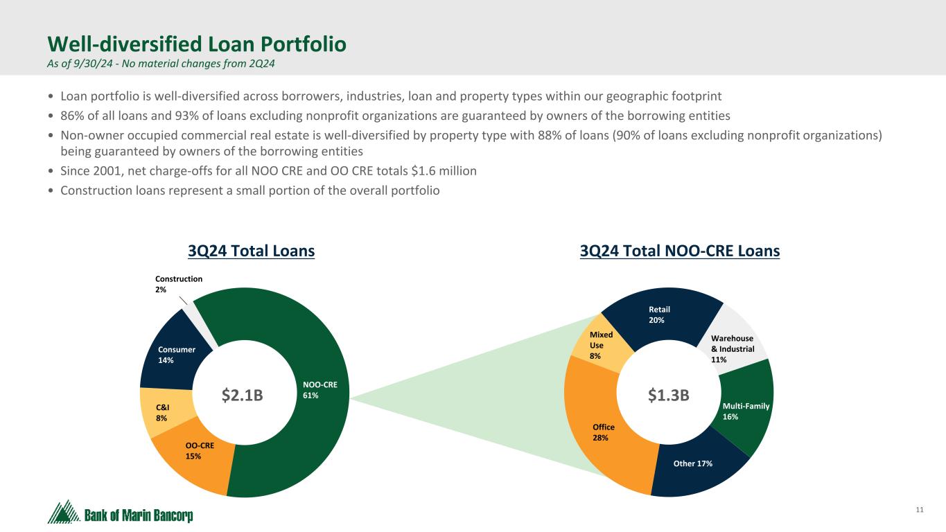 10 Text 95,96,96 Light Gray 232, 232, 232 Black 0, 0, 0 White 255, 255, 255 Accent 1 7,89,52 Accent 2 248,153,40 Accent 3 254,217,129 Accent 4 52,153,70 Accent 5 5,39,67 Accent 6 171,184,195 • Loan originations were at yields higher than those on paid off loans • Notable pipeline growth and diversification from key hires, enhanced compensation, and calling programs • Sound underwriting produces a high- quality loan portfolio with low credit costs and stable earnings through cycles • Extending credit and serving the needs of existing clients while ensuring new opportunities present the appropriate levels of risk and return Prudent, Sustainable Model for Loan Growth $1.843 $2.089 $2.256 $2.093 $2.074 $2.090 4.73% 4.15% 4.23% 4.29% 4.65% 4.79% Non-PPP Loans SBA PPP Loans Average Annual Yield on Loans 2019 2020 2021 2022 2023 3Q2024 Five-year compound annual loan growth rate: 3.4%1 Total Loans ($ in billions) 1 Compounded annual growth rate from September 30, 2019 to September 30, 2024 2 Includes American River Bank loans acquired in 3Q21 2