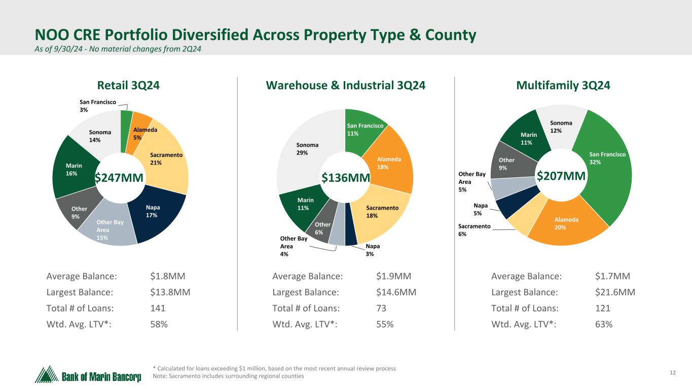 11 Text 95,96,96 Light Gray 232, 232, 232 Black 0, 0, 0 White 255, 255, 255 Accent 1 7,89,52 Accent 2 248,153,40 Accent 3 254,217,129 Accent 4 52,153,70 Accent 5 5,39,67 Accent 6 171,184,195 Well-diversified Loan Portfolio As of 9/30/24 - No material changes from 2Q24 • Loan portfolio is well-diversified across borrowers, industries, loan and property types within our geographic footprint • 86% of all loans and 93% of loans excluding nonprofit organizations are guaranteed by owners of the borrowing entities • Non-owner occupied commercial real estate is well-diversified by property type with 88% of loans (90% of loans excluding nonprofit organizations) being guaranteed by owners of the borrowing entities • Since 2001, net charge-offs for all NOO CRE and OO CRE totals $1.6 million • Construction loans represent a small portion of the overall portfolio OO-CRE 15% C&I 8% Consumer 14% Construction 2% NOO-CRE 61% 3Q24 Total Loans $2.1B Office 28% Mixed Use 8% Retail 20% Warehouse & Industrial 11% Multi-Family 16% Other 17% 3Q24 Total NOO-CRE Loans $1.3B