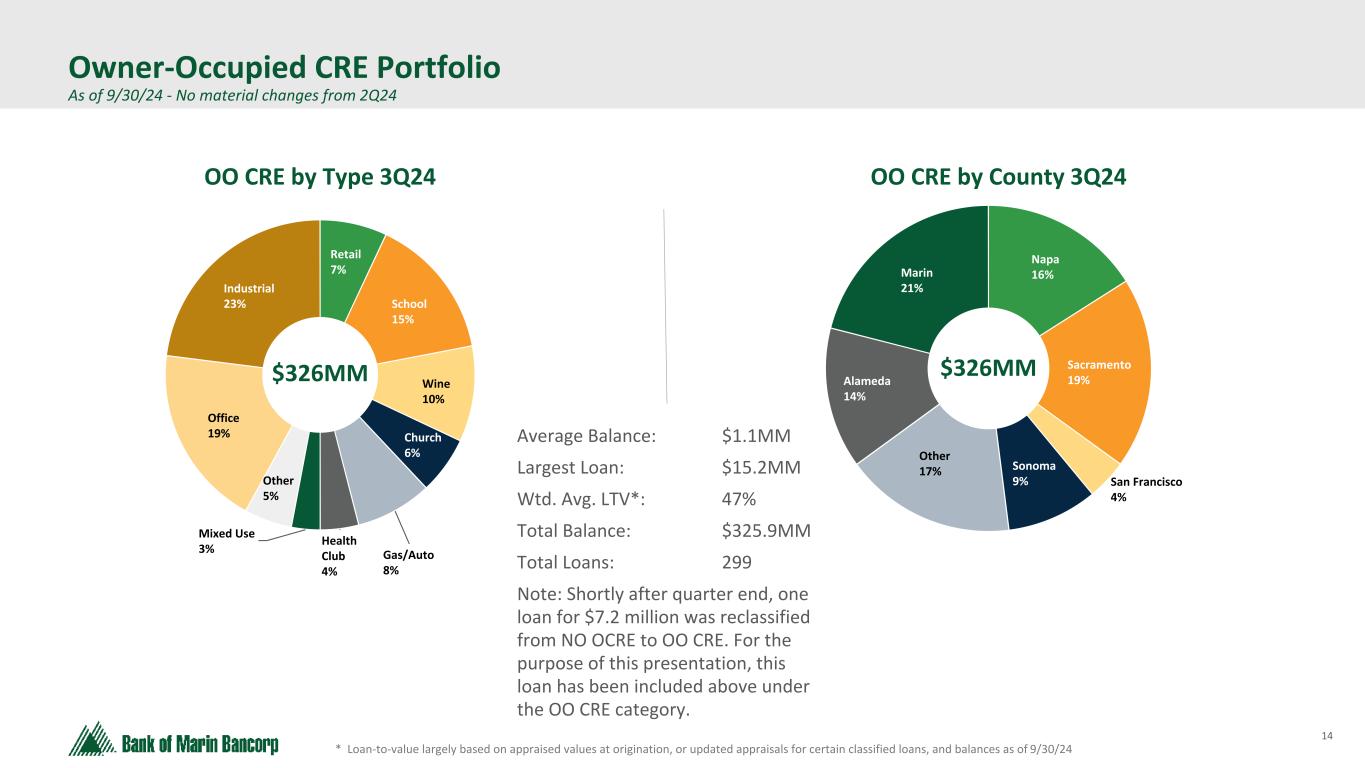 13 Text 95,96,96 Light Gray 232, 232, 232 Black 0, 0, 0 White 255, 255, 255 Accent 1 7,89,52 Accent 2 248,153,40 Accent 3 254,217,129 Accent 4 52,153,70 Accent 5 5,39,67 Accent 6 171,184,195 • $349 million in credit exposure spread across our lending footprint comprised of 144 loans • $2.4 million average loan balance – largest loan at $16.4 million • 59% weighted average loan-to-value and 1.60x weighted average debt-service coverage ratio* • City of San Francisco NOO CRE office exposure is 3% of total loan portfolio and 5% of total NOO CRE loans NOO CRE Office Portfolio by County * Calculated for loans exceeding $1 million, based on the most recent annual review process, and net of individual reserves Non-owner Occupied Office Exposure As of 9/30/24 - No material changes from 2Q24 San Francisco 19% Alameda 6% Sacramento 7% Napa 10% Other Bay Area 13% Other 4% Marin 24% Sonoma 17% $349MM City of S.F. NOO CRE Office Portfolio Total Balance: $62.5 million Average Loan Bal: $5.2 million Number of Loans: 12 loans Wtd. Average LTV*: 65% Wtd. Average DCR: 1.04x Average Occupancy: 81% 11 of the 12 loans are secured by low rise buildings and one loan is secured by a 10 story building Note: Shortly after quarter end, one loan for $7.2 million was reclassified to OO CRE. For the purpose of this presentation, this loan has been moved to the OO CRE category.