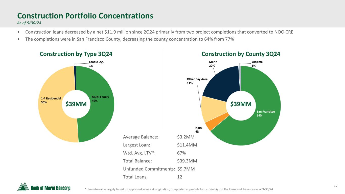 14 Text 95,96,96 Light Gray 232, 232, 232 Black 0, 0, 0 White 255, 255, 255 Accent 1 7,89,52 Accent 2 248,153,40 Accent 3 254,217,129 Accent 4 52,153,70 Accent 5 5,39,67 Accent 6 171,184,195 ($ in millions at Fair Value) * Loan-to-value largely based on appraised values at origination, or updated appraisals for certain classified loans, and balances as of 9/30/24 Owner-Occupied CRE Portfolio As of 9/30/24 - No material changes from 2Q24 Retail 7% School 15% Wine 10% Church 6% Gas/Auto 8% Health Club 4% Mixed Use 3% Other 5% Office 19% Industrial 23% Napa 16% Sacramento 19% San Francisco 4% Sonoma 9% Other 17% Alameda 14% Marin 21% OO CRE by County 3Q24 Average Balance: $1.1MM Largest Loan: $15.2MM Wtd. Avg. LTV*: 47% Total Balance: $325.9MM Total Loans: 299 Note: Shortly after quarter end, one loan for $7.2 million was reclassified from NO OCRE to OO CRE. For the purpose of this presentation, this loan has been included above under the OO CRE category. OO CRE by Type 3Q24 $326MM $326MM