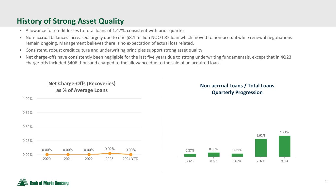 15 Text 95,96,96 Light Gray 232, 232, 232 Black 0, 0, 0 White 255, 255, 255 Accent 1 7,89,52 Accent 2 248,153,40 Accent 3 254,217,129 Accent 4 52,153,70 Accent 5 5,39,67 Accent 6 171,184,195 ($ in millions at Fair Value) * Loan-to-value largely based on appraised values at origination, or updated appraisals for certain high dollar loans and, balances as of 9/30/24 Construction Portfolio Concentrations As of 9/30/24 Construction by Type 3Q24 Construction by County 3Q24 Multi-Family 49% 1-4 Residential 50% Land & Ag. 1% San Francisco 64% Napa 4% Other Bay Area 11% Marin 20% Sonoma 1% Average Balance: $3.2MM Largest Loan: $11.4MM Wtd. Avg. LTV*: 67% Total Balance: $39.3MM Unfunded Commitments: $9.7MM Total Loans: 12 $39MM • Construction loans decreased by a net $11.9 million since 2Q24 primarily from two project completions that converted to NOO CRE • The completions were in San Francisco County, decreasing the county concentration to 64% from 77% $39MM