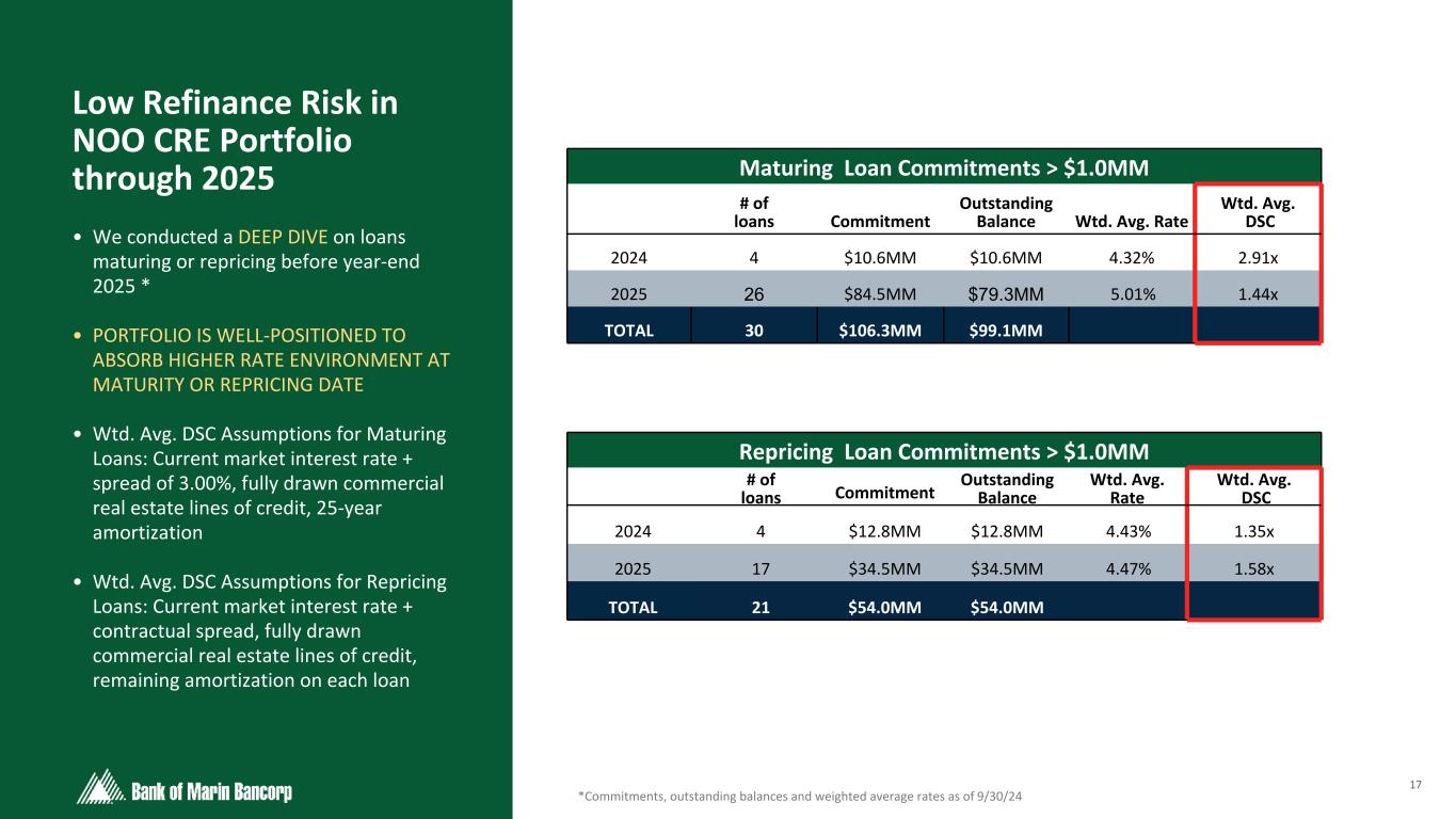 16 Text 95,96,96 Light Gray 232, 232, 232 Black 0, 0, 0 White 255, 255, 255 Accent 1 7,89,52 Accent 2 248,153,40 Accent 3 254,217,129 Accent 4 52,153,70 Accent 5 5,39,67 Accent 6 171,184,195 ($ in millions at Fair Value) History of Strong Asset Quality • Allowance for credit losses to total loans of 1.47%, consistent with prior quarter • Non-accrual balances increased largely due to one $8.1 million NOO CRE loan which moved to non-accrual while renewal negotiations remain ongoing. Management believes there is no expectation of actual loss related. • Consistent, robust credit culture and underwriting principles support strong asset quality • Net charge-offs have consistently been negligible for the last five years due to strong underwriting fundamentals, except that in 4Q23 charge-offs included $406 thousand charged to the allowance due to the sale of an acquired loan. Net Charge-Offs (Recoveries) as % of Average Loans 0.00% 0.00% 0.00% 0.02% 0.00% 2020 2021 2022 2023 2024YTD -0.0025 0 0.0025 0.005 0.0075 0.01 Non-accrual Loans / Total Loans Quarterly Progression 0.27% 0.39% 0.31% 1.62% 1.91% 3Q23 4Q23 1Q24 2Q24 3Q24 Net Charge-Offs (Recoveries) as % of Average Loans 0.00% 0.00% 0.00% 0.02% 0.00% 2020 2021 2022 2023 2024 YTD 0.00% 0.25% 0.50% 0.75% 1.00%