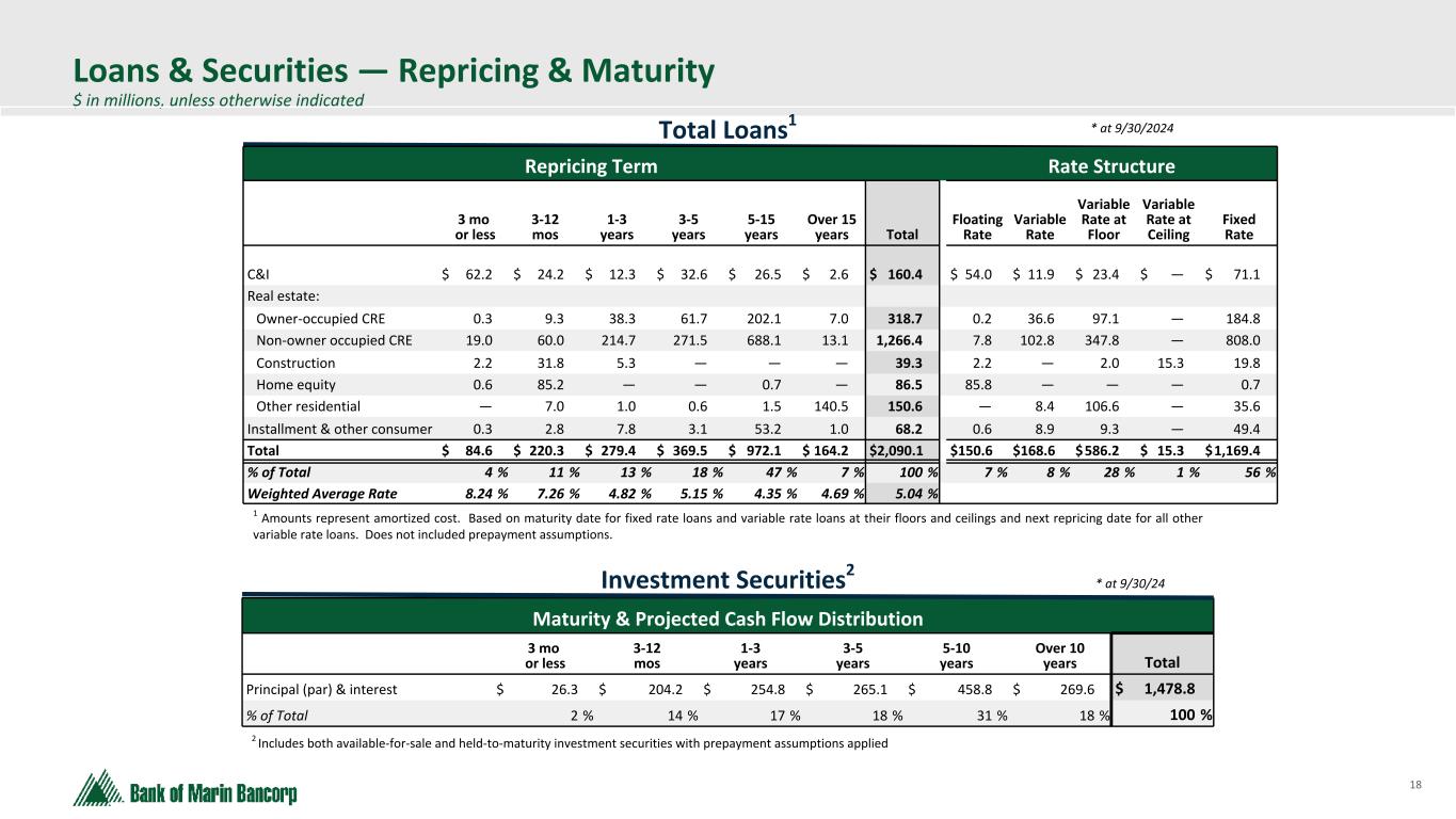17 Text 95,96,96 Light Gray 232, 232, 232 Black 0, 0, 0 White 255, 255, 255 Accent 1 7,89,52 Accent 2 248,153,40 Accent 3 254,217,129 Accent 4 52,153,70 Accent 5 5,39,67 Accent 6 171,184,195 Low Refinance Risk in NOO CRE Portfolio through 2025 • We conducted a DEEP DIVE on loans maturing or repricing before year-end 2025 * • PORTFOLIO IS WELL-POSITIONED TO ABSORB HIGHER RATE ENVIRONMENT AT MATURITY OR REPRICING DATE • Wtd. Avg. DSC Assumptions for Maturing Loans: Current market interest rate + spread of 3.00%, fully drawn commercial real estate lines of credit, 25-year amortization • Wtd. Avg. DSC Assumptions for Repricing Loans: Current market interest rate + contractual spread, fully drawn commercial real estate lines of credit, remaining amortization on each loan Maturing Loan Commitments > $1.0MM # of loans Commitment Outstanding Balance Wtd. Avg. Rate Wtd. Avg. DSC 2024 4 $10.6MM $10.6MM 4.32% 2.91x 2025 26 $84.5MM $79.3MM 5.01% 1.44x TOTAL 30 $106.3MM $99.1MM Repricing Loan Commitments > $1.0MM # of loans Commitment Outstanding Balance Wtd. Avg. Rate Wtd. Avg. DSC 2024 4 $12.8MM $12.8MM 4.43% 1.35x 2025 17 $34.5MM $34.5MM 4.47% 1.58x TOTAL 21 $54.0MM $54.0MM *Commitments, outstanding balances and weighted average rates as of 9/30/24