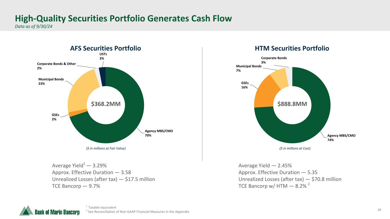 18 Text 95,96,96 Light Gray 232, 232, 232 Black 0, 0, 0 White 255, 255, 255 Accent 1 7,89,52 Accent 2 248,153,40 Accent 3 254,217,129 Accent 4 52,153,70 Accent 5 5,39,67 Accent 6 171,184,195 Loans & Securities — Repricing & Maturity $ in millions, unless otherwise indicated Total Loans1 * at 9/30/2024 Repricing Term Rate Structure 3 mo or less 3-12 mos 1-3 years 3-5 years 5-15 years Over 15 years Total Floating Rate Variable Rate Variable Rate at Floor Variable Rate at Ceiling Fixed Rate C&I $ 62.2 $ 24.2 $ 12.3 $ 32.6 $ 26.5 $ 2.6 $ 160.4 $ 54.0 $ 11.9 $ 23.4 $ — $ 71.1 Real estate: Owner-occupied CRE 0.3 9.3 38.3 61.7 202.1 7.0 318.7 0.2 36.6 97.1 — 184.8 Non-owner occupied CRE 19.0 60.0 214.7 271.5 688.1 13.1 1,266.4 7.8 102.8 347.8 — 808.0 Construction 2.2 31.8 5.3 — — — 39.3 2.2 — 2.0 15.3 19.8 Home equity 0.6 85.2 — — 0.7 — 86.5 85.8 — — — 0.7 Other residential — 7.0 1.0 0.6 1.5 140.5 150.6 — 8.4 106.6 — 35.6 Installment & other consumer 0.3 2.8 7.8 3.1 53.2 1.0 68.2 0.6 8.9 9.3 — 49.4 Total $ 84.6 $ 220.3 $ 279.4 $ 369.5 $ 972.1 $ 164.2 $ 2,090.1 $ 150.6 $ 168.6 $ 586.2 $ 15.3 $ 1,169.4 % of Total 4 % 11 % 13 % 18 % 47 % 7 % 100 % 7 % 8 % 28 % 1 % 56 % Weighted Average Rate 8.24 % 7.26 % 4.82 % 5.15 % 4.35 % 4.69 % 5.04 % 1 Amounts represent amortized cost. Based on maturity date for fixed rate loans and variable rate loans at their floors and ceilings and next repricing date for all other variable rate loans. Does not included prepayment assumptions. Investment Securities2 * at 9/30/24 2 Includes both available-for-sale and held-to-maturity investment securities with prepayment assumptions applied Maturity & Projected Cash Flow Distribution 3 mo or less 3-12 mos 1-3 years 3-5 years 5-10 years Over 10 years Total Principal (par) & interest $ 26.3 $ 204.2 $ 254.8 $ 265.1 $ 458.8 $ 269.6 $ 1,478.8 % of Total 2 % 14 % 17 % 18 % 31 % 18 % 100 %