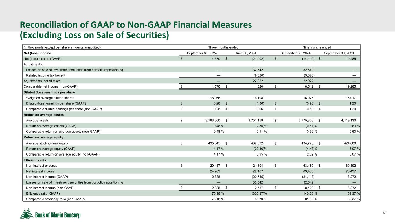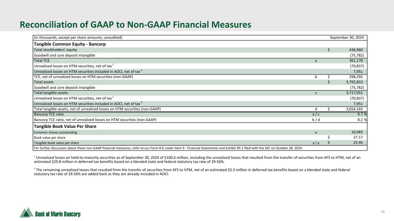21 Text 95,96,96 Light Gray 232, 232, 232 Black 0, 0, 0 White 255, 255, 255 Accent 1 7,89,52 Accent 2 248,153,40 Accent 3 254,217,129 Accent 4 52,153,70 Accent 5 5,39,67 Accent 6 171,184,195 Reconciliation of GAAP to Non-GAAP Financial Measures (in thousands, except per share amounts; unaudited) September 30, 2024 Tangible Common Equity - Bancorp Total stockholders' equity $ 436,960 Goodwill and core deposit intangible (75,782) Total TCE a 361,178 Unrealized losses on HTM securities, net of tax 1 (70,837) Unrealized losses on HTM securities included in AOCI, net of tax 2 7,951 TCE, net of unrealized losses on HTM securities (non-GAAP) b $ 298,292 Total assets $ 3,792,833 Goodwill and core deposit intangible (75,782) Total tangible assets c 3,717,051 Unrealized losses on HTM securities, net of tax 1 (70,837) Unrealized losses on HTM securities included in AOCI, net of tax 2 7,951 Total tangible assets, net of unrealized losses on HTM securities (non-GAAP) d $ 3,654,165 Bancorp TCE ratio a / c 9.7 % Bancorp TCE ratio, net of unrealized losses on HTM securities (non-GAAP) b / d 8.2 % Tangible Book Value Per Share Common shares outstanding e 16,083 Book value per share $ 27.17 Tangible book value per share a / e $ 22.46 For further discussion about these non-GAAP financial measures, refer to our Form 8-K under Item 9 - Financial Statements and Exhibit 99.1 filed with the SEC on October 28, 2024. 1 Unrealized losses on held-to-maturity securities as of September 30, 2024 of $100.6 million, including the unrealized losses that resulted from the transfer of securities from AFS to HTM, net of an estimated $29.8 million in deferred tax benefits based on a blended state and federal statutory tax rate of 29.56%. 2 The remaining unrealized losses that resulted from the transfer of securities from AFS to HTM, net of an estimated $3.3 million in deferred tax benefits based on a blended state and federal statutory tax rate of 29.56% are added back as they are already included in AOCI.