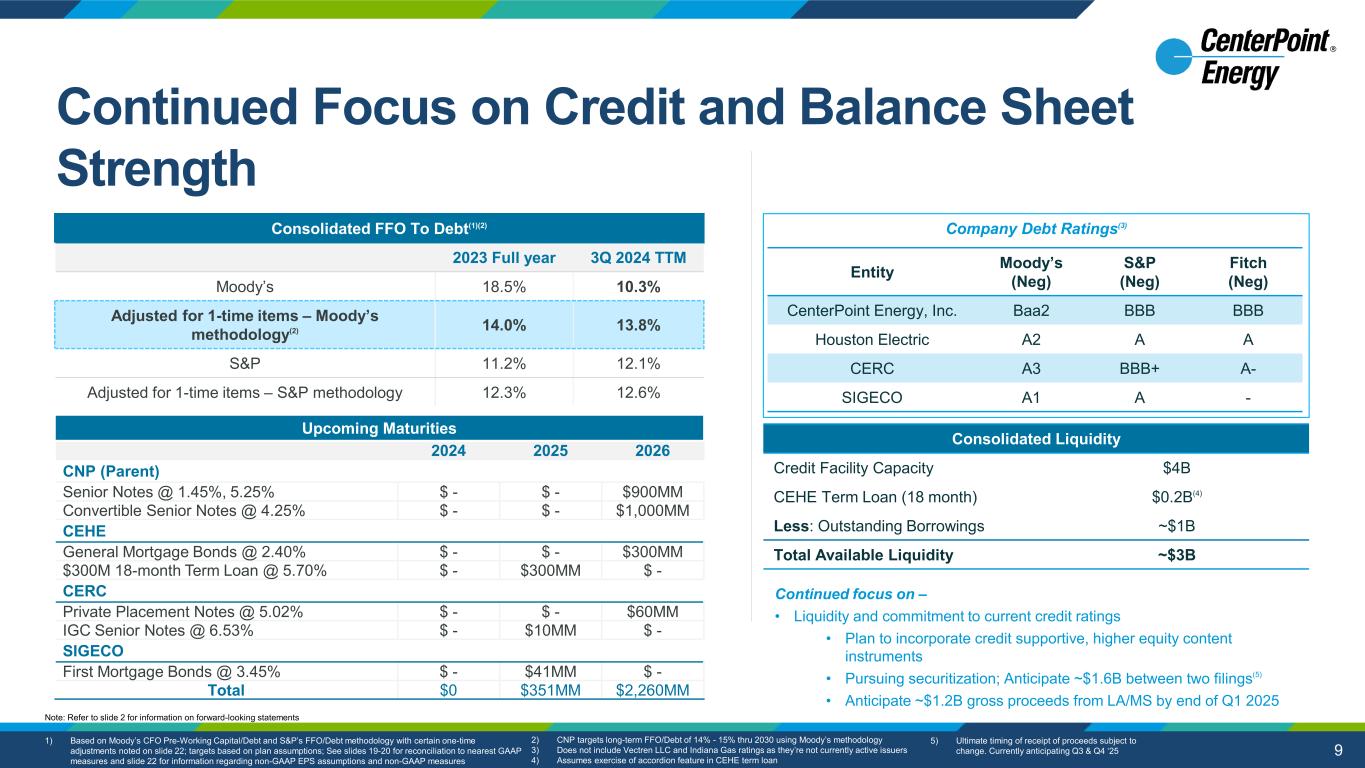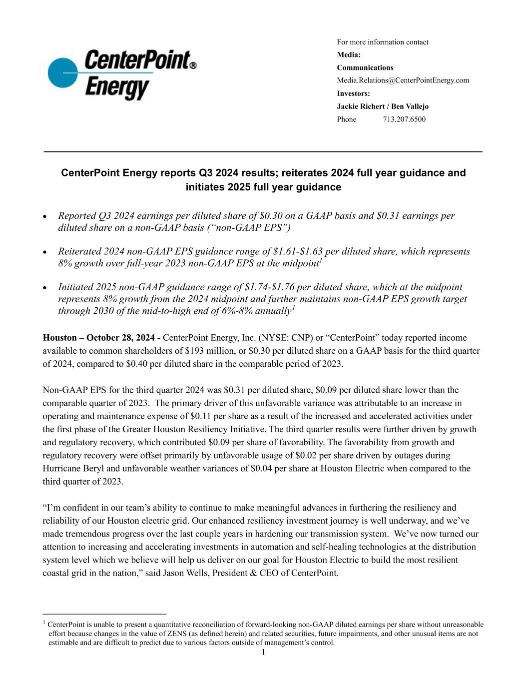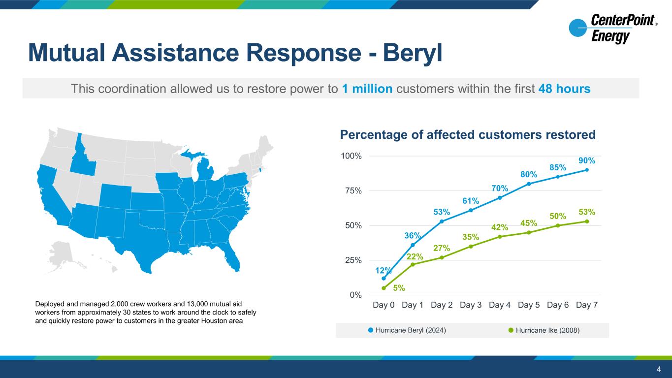 2 This presentation and the oral statements made in connection herewith contain “forward-looking statements” within the meaning of Section 27A of the Securities Act of 1933 and Section 21E of the Securities Exchange Act of 1934. All statements other than statements of historical fact included in this presentation and the oral statements made in connection herewith are forward-looking statements made in good faith by CenterPoint Energy, Inc. (“CenterPoint Energy” or the “Company”) and are intended to qualify for the safe harbor from liability established by the Private Securities Litigation Reform Act of 1995, including statements concerning CenterPoint Energy’s expectations, beliefs, plans, objectives, goals, strategies, future operations, events, financial position, earnings and guidance, growth, costs, prospects, capital investments or performance or underlying assumptions and other statements that are not historical facts. You should not place undue reliance on forward-looking statements. You can generally identify our forward- looking statements by the words “anticipate,” “believe,” “continue,” “could,” “estimate,” “expect,” “forecast,” “goal,” “intend,” “may,” “objective,” “plan,” “potential,” “predict,” “projection,” “should,” “target,” “will,” or other similar words. The absence of these words, however, does not mean that the statements are not forward-looking. Examples of forward-looking statements in this presentation and the oral statements made in connection herewith include statements about Houston Electric’s Greater Houston Resiliency Initiative ("GHRI") and longer-term resiliency plans, capital investments (including with respect to incremental capital opportunities, deployment of capital, renewables projects, and financing of such projects), the timing of and projections for upcoming rate cases for CenterPoint Energy and its subsidiaries, the timing and extent of CenterPoint Energy's recovery, including with regards to its restoration costs for the severe weather events in May 2024 ("May 2024 Storm Events") and Hurricane Beryl, its generation transition plans and projects, projects included in CenterPoint Energy's Natural Gas Innovation Plan and System Resiliency Plan, and projects included under its 10-year capital plan, the extent of anticipated benefits of new legislation, the pending sale of our Louisiana and Mississippi natural gas LDC businesses, future earnings and guidance, including long-term growth rate, customer charges, operations and maintenance expense reductions, financing plans (including with respect to the restoration costs for the May 2024 Storm Events and Hurricane Beryl and the timing of any future equity issuances, securitization, credit metrics and parent level debt), the timing and anticipated benefits of our generation transition plan, including our exit from coal and our 10-year capital plan, the Company’s 2.0% Zero-Premium Exchangeable Subordinated Notes due 2029 (“ZENS”) and impacts of the maturity of ZENS, CenterPoint's continued focus on liquidity and credit ratings, tax planning opportunities, future financial performance and results of operations, including with respect to regulatory actions and recoverability of capital investments, customer rate affordability, value creation, opportunities and expectations, expected customer growth, and sustainability strategy, including our net zero and greenhouse gas emissions reduction goals. We have based our forward-looking statements on our management’s beliefs and assumptions based on information currently available to our management at the time the statements are made. We caution you that assumptions, beliefs, expectations, intentions, and projections about future events may and often do vary materially from actual results. Therefore, we cannot assure you that actual results will not differ materially from those expressed or implied by our forward-looking statements. Some of the factors that could cause actual results to differ from those expressed or implied by our forward-looking statements include, but are not limited to, risks and uncertainties relating to: (1) CenterPoint Energy’s business strategies and strategic initiatives, restructurings, joint ventures and acquisitions or dispositions of assets or businesses, including the announced sale of our Louisiana and Mississippi natural gas LDC businesses, and the completed sale of Energy Systems Group, LLC, which we cannot assure you will have the anticipated benefits to us; (2) industrial, commercial and residential growth in CenterPoint Energy’s service territories and changes in market demand; (3) CenterPoint Energy’s ability to fund and invest planned capital, and the timely recovery of its investments; (4) financial market and general economic conditions, including access to debt and equity capital, inflation, interest rates, and their effect on sales, prices and costs; (5) disruptions to the global supply chain and volatility in commodity prices; (6) actions by credit rating agencies, including any potential downgrades to credit ratings; (7) the timing and impact of regulatory proceedings and actions and legal proceedings, including those related to the May 2024 Storm Events and Hurricane Beryl, Houston Electric’s mobile generation and the February 2021 winter storm event; (8) legislative and regulatory actions or developments, including any actions resulting from the May 2024 Storm Events and Hurricane Beryl, as well as tax and developments related to the environment such as global climate change, air emissions, carbon, waste water discharges and the handling of coal combustion residuals, among others, and CenterPoint Energy’s net zero and carbon emissions reduction goals; (9) the impact of pandemics; (10) weather variations and CenterPoint Energy’s ability to mitigate weather impacts, including the approval and timing of securitizat