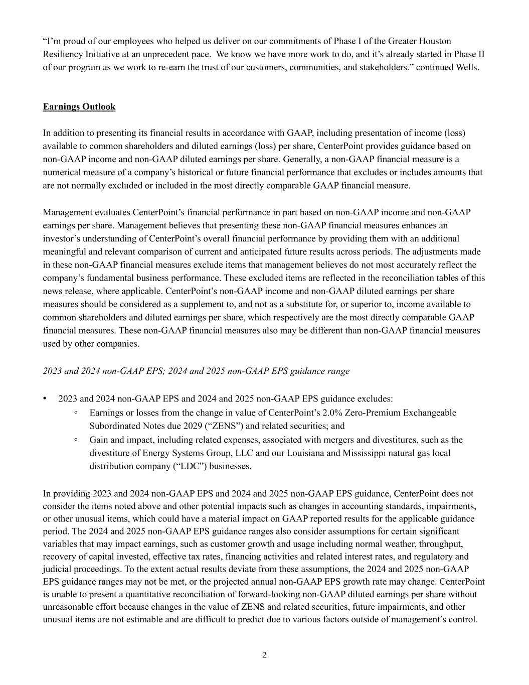 22 Use of Non-GAAP Financial Measures In this presentation and the oral statements made in connection herewith, CenterPoint Energy presents, based on income available to common shareholders, diluted earnings per share, and net cash provided by operating activities to total debt, net, and gross margin to total debt, net, the following financial measures which are not generally accepted accounting principles (“GAAP”) financial measures: non-GAAP income, non-GAAP earnings per share (“non-GAAP EPS”), as well as non-GAAP funds from operations / non-GAAP rating agency adjusted debt (Moody’s and S&P) (“FFO/Debt”). Generally, a non-GAAP financial measure is a numerical measure of a company’s historical or future financial performance that excludes or includes amounts that are not normally excluded or included in the most directly comparable GAAP financial measure. 2023 and 2024 non-GAAP EPS excluded and 2024 and 2025 non-GAAP EPS guidance excludes: (a) Earnings or losses from the change in value of ZENS and related securities, and (b) Gain and impact, including related expenses, associated with mergers and divestitures, such as the divestiture of Energy Systems Group, LLC, and the Louisiana and Mississippi gas LDC sales. In providing this guidance, CenterPoint Energy does not consider the items noted above and other potential impacts such as changes in accounting standards, impairments or other unusual items, which could have a material impact on GAAP reported results for the applicable guidance period. The 2024 and 2025 non-GAAP EPS guidance ranges also consider assumptions for certain significant variables that may impact earnings, such as customer growth and usage including normal weather, throughput, recovery of capital invested, effective tax rates, financing activities and related interest rates, and regulatory and judicial proceedings. To the extent actual results deviate from these assumptions, the 2024 and 2025 non-GAAP EPS guidance ranges may not be met or the projected annual non-GAAP EPS growth rate may change. CenterPoint Energy is unable to present a quantitative reconciliation of forward-looking non-GAAP diluted earnings per share because changes in the value of ZENS and related securities, future impairments, and other unusual items are not estimable and are difficult to predict due to various factors outside of management’s control. Funds from operations (Moody’s) excludes from net cash provided by operating activities accounts receivable and unbilled revenues, net, inventory, taxes receivable, accounts payable, and other current assets and liabilities, and includes certain adjustments consistent with Moody’s methodology, including adjustments related to total lease costs (net of lease income), Series A preferred stock dividends, and defined benefit plan contributions (less service costs). Non-GAAP rating agency adjusted debt (Moody’s) adds to Total Debt, net certain adjustments consistent with Moody’s methodology, including Series A preferred stock, pension benefit obligations, and operating lease liabilities and further adjustments related to Winter Storm Uri debt and one time cash taxes. Funds from operations (S&P) excludes from gross margin O&M, taxes and other, cash interest paid and cash taxes paid, and includes certain adjustments consistent with S&P's methodology, including adjustments related to total lease costs (net of lease income), Series A preferred stock dividends, non-recurring items, and defined benefit plan. Non-GAAP rating agency adjusted debt (S&P) adds to Total Debt, net certain adjustments consistent with S&P's methodology, including adjustments related to Winter Storm Uri related one-time cash tax. The appendix to this presentation contains a reconciliation of income (loss) available to common shareholders and diluted earnings (loss) per share to the basis used in providing guidance, as well as a reconciliation of net cash provided by operating activities / total debt, net (and gross margin to total debt, net) to FFO/Debt. Management evaluates the Company’s financial performance in part based on non-GAAP income, non-GAAP EPS and long-term FFO/Debt. Management believes that presenting these non-GAAP financial measures enhances an investor’s understanding of CenterPoint Energy’s overall financial performance by providing them with an additional meaningful and relevant comparison of current and anticipated future results across periods. The adjustments made in these non-GAAP financial measures exclude items that Management believes do not most accurately reflect the Company’s fundamental business performance. These excluded items are reflected in the reconciliation tables, where applicable. CenterPoint Energy’s non-GAAP income, non-GAAP EPS and FFO/Debt financial measures should be considered as a supplement to, and not as a substitute for, or superior to, income available to common shareholders, diluted earnings per share, net cash provided by operating activities to total debt, net and gross margin to total debt, net, which, respectively, are the most directly comparable GAAP financial measures. These non-GAAP financial measures also may be different than non-GAAP financial measures used by other companies. Net Zero Disclaimer CenterPoint Energy’s Scope 1 GHG emissions estimates are calculated from GHG emissions that directly come from its operations. CenterPoint Energy’s Scope 2 GHG emissions estimates are calculated from GHG emissions that indirectly come from its energy usage, but because Texas is in an unregulated market, its Scope 2 GHG estimates do not take into account Texas electric transmission and distribution assets in the line loss calculation and exclude GHG emissions related to purchased power between 2024E-2026E. CenterPoint Energy’s Scope 3 GHG emissions estimates are based on the total natural gas supply delivered to residential and commercial customers as reported in the U.S. Energy Information Adm