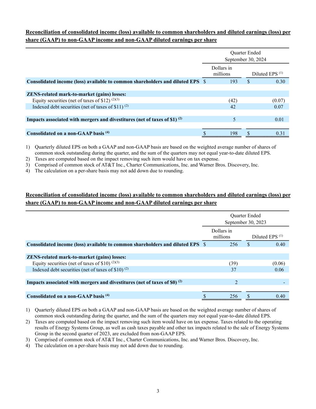 17 aaaaaaaaa Quarter Ended Year-to-Date Ended September 30, 2024 September 30, 2024 Dollars in millions Diluted EPS(1) Dollars in millions Diluted EPS(1) Consolidated income (loss) available to common shareholders and diluted EPS $ 193 $ 0.30 $ 771 $ 1.20 ZENS-related mark-to-market (gains) losses: Equity securities (net of taxes of $12 and $1, respectively)(2)(3) (42) (0.07) 9 0.01 Indexed debt securities (net of taxes of $11 and $3, respectively)(2) 42 0.07 (11) (0.02) Impacts associated with mergers and divestitures (net of taxes of $1 and $5, respectively)(2) 5 0.01 13 0.02 Consolidated on a non-GAAP basis(4) $ 198 $ 0.31 $ 782 $ 1.22 (1) Quarterly diluted EPS on both a GAAP and non-GAAP basis are based on the weighted average number of shares of common stock outstanding during the quarter, and the sum of the quarters may not equal year-to-date diluted EPS (2) Taxes are computed based on the impact removing such item would have on tax expense. (3) Comprised of common stock of AT&T Inc., Charter Communications, Inc., and Warner Bros. Discovery, Inc. (4) The calculation on a per-share basis may not add down due to rounding Reconciliation: Income (Loss) and Diluted Earnings (Loss) per share to non-GAAP Income and non-GAAP Diluted EPS used in providing annual earnings guidance