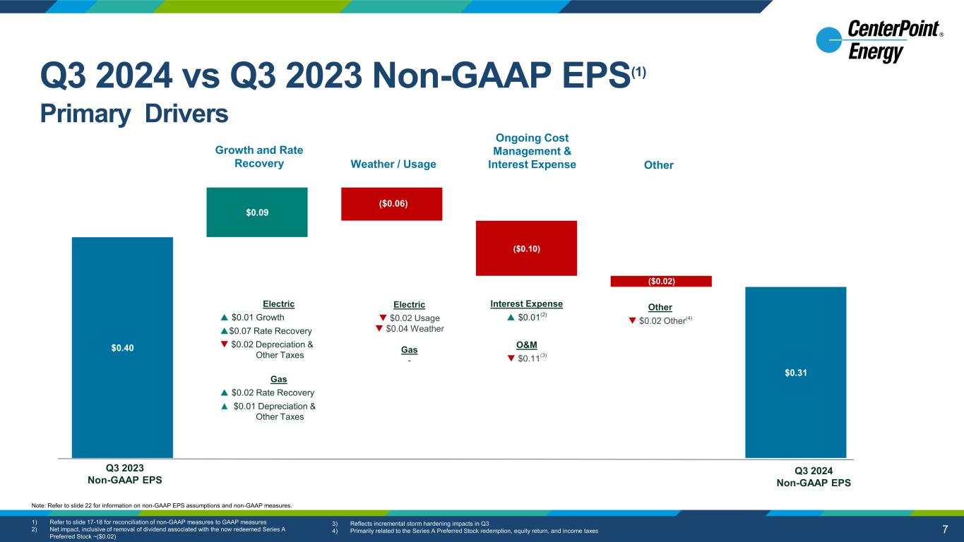 6 IN Electric (Docket 45990) MN Gas (Docket 23-173) Houston Electric (Docket 56211) OH Gas (Docket 24-0832-GA-AIR ) Date Filed Proposed Settlement Filed Key Details Below November 1, 2023 March 6, 2024 Yet to be Filed Test Year End Forward test year: 2024 & 2025 2023 Forward test year: 2024 Revenue Request $80MM (Proposed)(2) 2024: $84.6MM 2025: $51.8MM $56MM TBD Equity Layer / ROE(1) Settlement(2)(3): 48.3% / 9.8% Requested: 48.3% / 10.4% Authorized:43.5% / 10.4% Requested: 52.5% / 10.3% Authorized: 51.0% / 9.4% Requested: 44.9% / 10.4% Authorized: 42.5% / 9.4% Requested: TBD Authorized: 51.1% / Confidential Debt Layer / Cost of Debt Settlement(2): 39.5% / 5.1% Requested: 39.5% / 5.1% Authorized: 43.6% / 6.3% Requested: 47.5% / 4.5% Authorized: 49.0% / 4.1% Requested: 55.1% / 4.3% Authorized: 57.5% / 4.4% Requested: TBD Authorized: 48.9% / 5.1% Key Dates(5) Customer rates to be updated March ’25 and March ’26; Final Order on Feb 3, 2025(4) Interim Rates effective as of Jan 1, 2024(6); Settlement Conference on Dec 16, 2024 PUCT scheduled to hear withdrawal on Nov. 14, 2024 Expected to be filed on October 29, 2024 1) Authorized refers to current authorization prior to case outcome 2) Partial settlement filed on May 20, 2024 3) Equity % net of cost-free capital and other capital comprised of 11.90% and 0.33%, respectively 4) IURC can extend up to 60 days for “Good Cause” 5) Future dates are expected 6) Based on Revenue Requirement of $68.7MM Note: Refer to slide 2 for information on forward-looking statements (Requested to withdraw Aug. 2024) Rate Case Snapshot