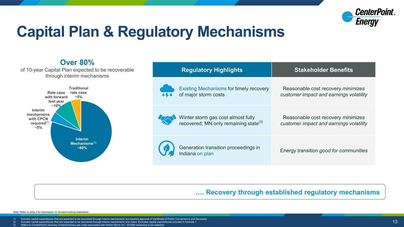 12 Targeting Our 4th Efficient Recycling of Capital over the last 3 years Transaction Highlights Announced Feb 2024 Efficiently recycle capital, upside for additional CapEx Supports balance sheet optimization Signals continued demand for U.S. gas LDC’s Aligns with the continued execution of our plan Key Transaction Terms Gross Purchase Price: ~$1,200MM Net Purchase Price: ~$1,000MM 1.55x of 2023 rate base(1) ~32x of 2023 earnings(2) Buyer: Bernhard Capital Anticipated transaction close: By end of Q1 2025 Proceeds Calculation ($ in millions) Gross Purchase Price ~$1,200 Taxes(3) and transaction costs ~$200 Net Proceeds ~$1,000 Transaction Updates LPSC and MPSC approval applications filed in April 2024 HSR application filed in March 2024 1) 2023 year-end rate base of approximately $800MM, inclusive of North and South Louisiana and Mississippi 2) Represents earnings multiple net of ~$400MM opco debt paydown; Estimated earnings for 2023 on a standalone basis of $25.7MM. Subject to a true-up at transaction close 3) Assumes blended tax rate of 23.5%, inclusive of state taxes Note: Refer to slide 2 for information on forward-looking statements. Based on forecasted year-end rate base. Louisiana and Mississippi LDC Sale