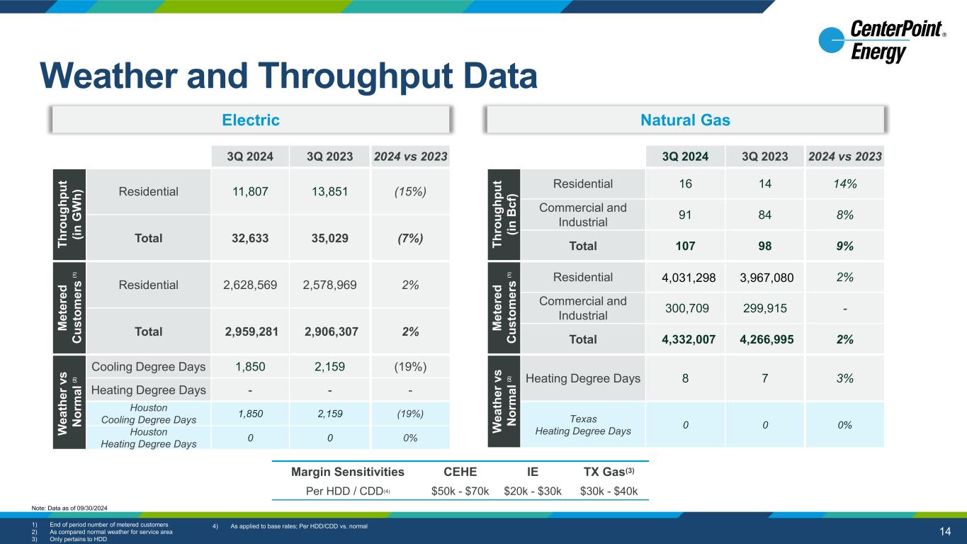 14 aaaaaaaaa Electric Natural Gas 3Q 2024 3Q 2023 2024 vs 2023 Th ro ug hp ut (in G W h) Residential 11,807 13,851 (15%) Total 32,633 35,029 (7%) M et er ed C us to m er s (1 ) Residential 2,628,569 2,578,969 2% Total 2,959,281 2,906,307 2% W ea th er v s N or m al (2 ) Cooling Degree Days 1,850 2,159 (19%) Heating Degree Days - - - Houston Cooling Degree Days 1,850 2,159 (19%) Houston Heating Degree Days 0 0 0% 3Q 2024 3Q 2023 2024 vs 2023 Th ro ug hp ut (in B cf ) Residential 16 14 14% Commercial and Industrial 91 84 8% Total 107 98 9% M et er ed C us to m er s (1 ) Residential 4,031,298 3,967,080 2% Commercial and Industrial 300,709 299,915 - Total 4,332,007 4,266,995 2% W ea th er v s N or m al (2 ) Heating Degree Days 8 7 3% Texas Heating Degree Days 0 0 0% Margin Sensitivities CEHE IE TX Gas(3) Per HDD / CDD(4) $50k - $70k $20k - $30k $30k - $40k 1) End of period number of metered customers 2) As compared normal weather for service area 3) Only pertains to HDD 4) As applied to base rates; Per HDD/CDD vs. normal Note: Data as of 09/30/2024 Weather and Throughput Data