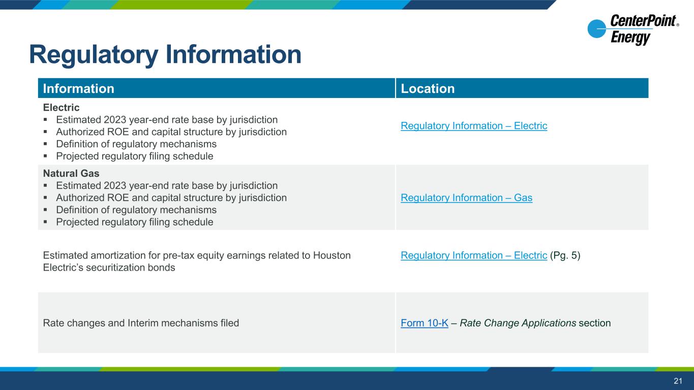 21 aaaaaaaaa Information Location Electric Estimated 2023 year-end rate base by jurisdiction Authorized ROE and capital structure by jurisdiction Definition of regulatory mechanisms Projected regulatory filing schedule Regulatory Information – Electric Natural Gas Estimated 2023 year-end rate base by jurisdiction Authorized ROE and capital structure by jurisdiction Definition of regulatory mechanisms Projected regulatory filing schedule Regulatory Information – Gas Estimated amortization for pre-tax equity earnings related to Houston Electric’s securitization bonds Regulatory Information – Electric (Pg. 5) Rate changes and Interim mechanisms filed Form 10-K – Rate Change Applications section Regulatory Information