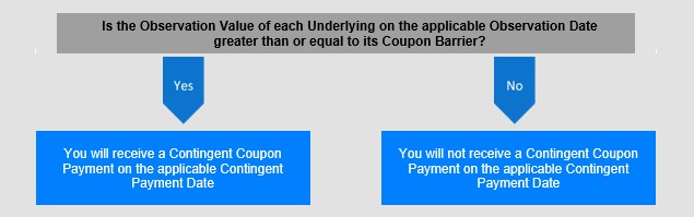 If, on any quarterly Observation Date, the Observation Value of each Underlying is greater than or equal to its Coupon Barrier, we will pay a Contingent Coupon Payment of $21.875 per $1,000.00 in principal amount of Notes (equal to a rate of 2.1875% per quarter or 8.75% per annum) on the applicable Contingent Payment Date (including the Maturity Date). |