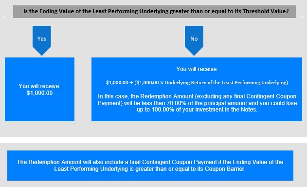 The Redemption Amount will also include a final Contingent Coupon Payment if the Ending Value of the Least Performing Underlying is greater than or equal to its Coupon Barrier. |