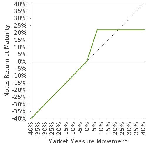 This graph reflects the returns on the notes, based on the Participation Rate of 300% and the Capped Value of $12.385 per unit. The green line reflects the returns on the notes, while the dotted gray line reflects the returns of a direct investment in the Underlying Fund, excluding dividends.