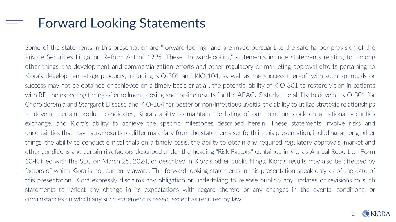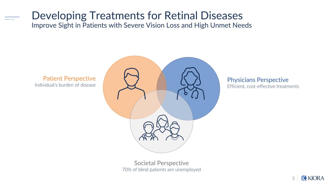 2 Forward Looking Statements Some of the statements in this presentation are "forward-looking" and are made pursuant to the safe harbor provision of the Private Securities Litigation Reform Act of 1995. These "forward-looking" statements include statements relating to, among other things, the development and commercialization efforts and other regulatory or marketing approval efforts pertaining to Kiora's development-stage products, including KIO-301 and KIO-104, as well as the success thereof, with such approvals or success may not be obtained or achieved on a timely basis or at all, the potential ability of KIO-301 to restore vision in patients with RP, the expecting timing of enrollment, dosing and topline results for the ABACUS study, the ability to develop KIO-301 for Choroideremia and Stargardt Disease and KIO-104 for posterior non-infectious uveitis, the ability to utilize strategic relationships to develop certain product candidates, Kiora’s ability to maintain the listing of our common stock on a national securities exchange, and Kiora's ability to achieve the specific milestones described herein. These statements involve risks and uncertainties that may cause results to differ materially from the statements set forth in this presentation, including, among other things, the ability to conduct clinical trials on a timely basis, the ability to obtain any required regulatory approvals, market and other conditions and certain risk factors described under the heading "Risk Factors" contained in Kiora's Annual Report on Form 10-K filed with the SEC on March 25, 2024, or described in Kiora's other public filings. Kiora's results may also be affected by factors of which Kiora is not currently aware. The forward-looking statements in this presentation speak only as of the date of this presentation. Kiora expressly disclaims any obligation or undertaking to release publicly any updates or revisions to such statements to reflect any change in its expectations with regard thereto or any changes in the events, conditions, or circumstances on which any such statement is based, except as required by law.