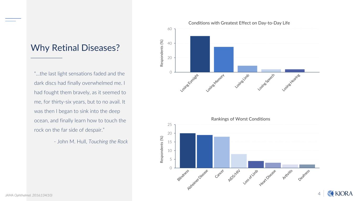 3 Developing Treatments for Retinal Diseases Improve Sight in Patients with Severe Vision Loss and High Unmet Needs Patient Perspective Individual’s burden of disease Physicians Perspective Efficient, cost-effective treatments Societal Perspective 70% of blind patients are unemployed