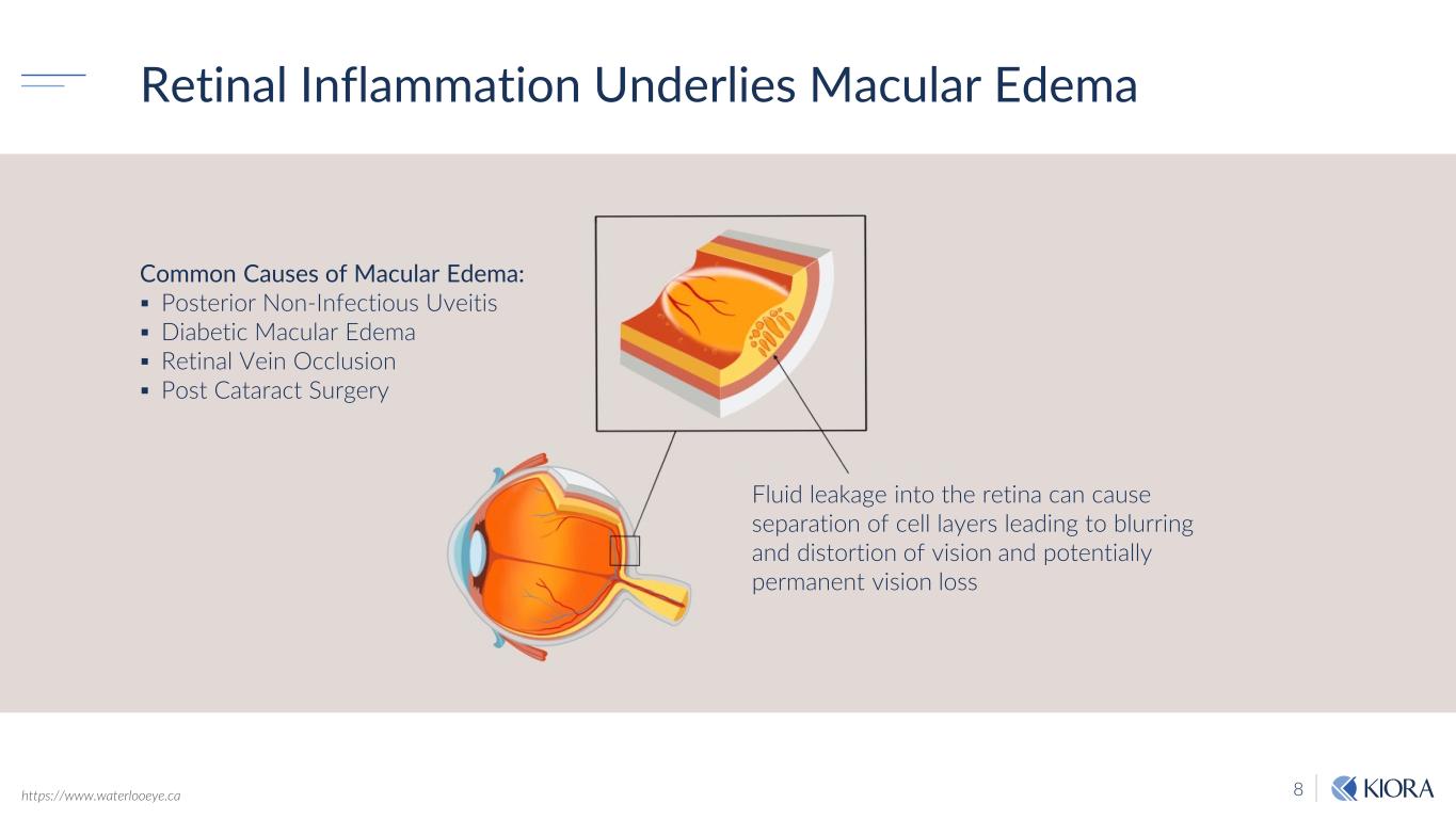 8 Retinal Inflammation Underlies Macular Edema Fluid leakage into the retina can cause separation of cell layers leading to blurring and distortion of vision and potentially permanent vision loss https://www.waterlooeye.ca Common Causes of Macular Edema: Posterior Non-Infectious Uveitis Diabetic Macular Edema Retinal Vein Occlusion Post Cataract Surgery