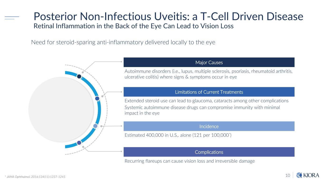 9 T-cells are known to play a fundamental role in inducing ocular inflammation Dihydroorotate Dehydrogenase (DHODH) inhibitors are well established, disease-modifying agents in autoimmune conditions KIO-104 Mechanism of Action DHODH inhibition reduces the cellular pyrimidine pool resulting in: Reduction of T-cell proliferation Downregulation of cellular messengers (IL-17, IFN-ɤ, VEGF, etc.) Dihydroorotate Orotate / Pyrimidines KIO-104 Inhibits DHODH Dihydroorotate Dehydrogenase (DHODH) Dihydroorotate Orotate / Pyrimidines DHODH necessary for production of pyrimidines Pyrimidines necessary for T-cell production and normal cell function Dihydroorotate Dehydrogenase (DHODH) Normal Process By inhibiting DHODH, one reduces ocular inflammation KIO-104 Clinical Aim KIO-104 Inflammation Reduces Inflammation