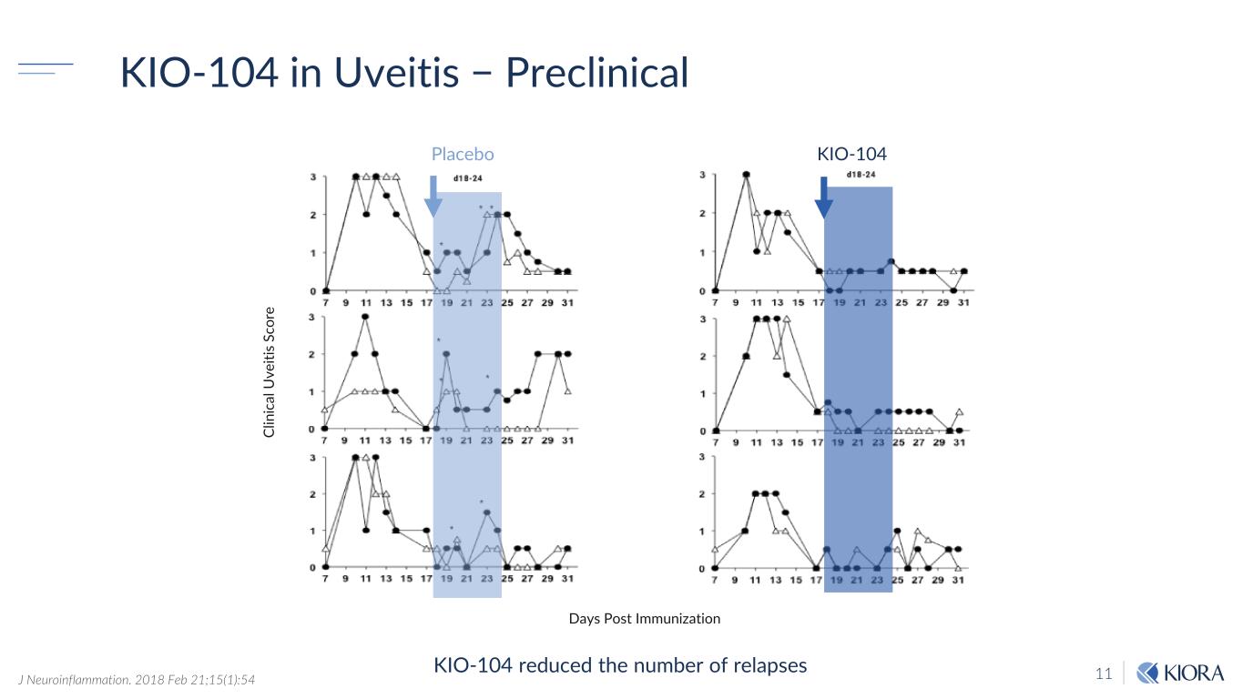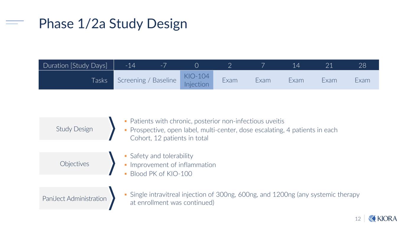 11 KIO-104 in Uveitis − Preclinical KIO-104 reduced the number of relapses Placebo Days Post Immunization Cl in ic al U ve iti s Sc or e KIO-104 J Neuroinflammation. 2018 Feb 21;15(1):54