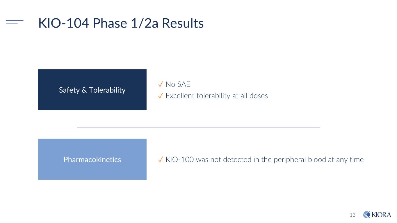 12 Phase 1/2a Study Design Safety and tolerability Improvement of inflammation Blood PK of KIO-100 Single intravitreal injection of 300ng, 600ng, and 1200ng (any systemic therapy at enrollment was continued) Patients with chronic, posterior non-infectious uveitis Prospective, open label, multi-center, dose escalating, 4 patients in each Cohort, 12 patients in total Duration [Study Days] -14 -7 0 2 7 14 21 28 Tasks Screening / Baseline KIO-104 Injection Exam Exam Exam Exam Exam Study Design Objectives PaniJect Administration